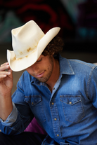 Creme, wool felt drifter with faux distress in shades of brown. This hat has the look of a favorite hat that's been worn on the ranch.