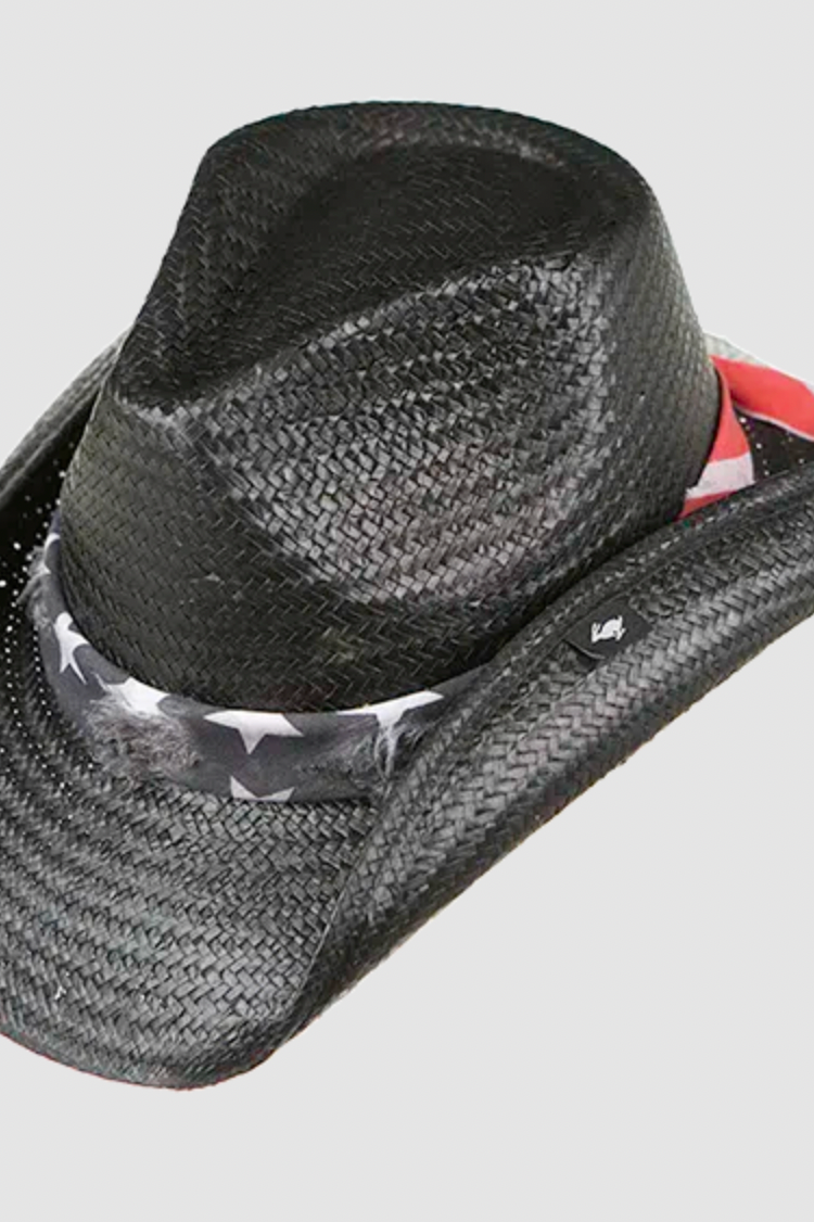 This is a classic western style drifter hat in Black paired with a distressed patriotic band.