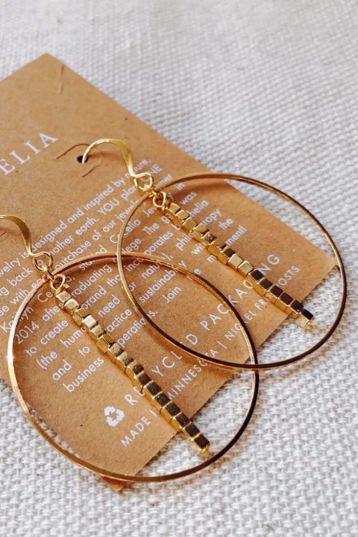 Our Hepburn Drop Earring Collection is handmade in Minnesota. You plant one tree with each purchase. These lightweight earrings are made with gold plated beads and nickel free earring hooks. 2.25" L x 2" W.