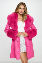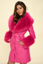Hot pink vegan belted vegan leather coat with matching fur collar and sleeve detail.