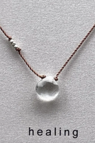 Healing necklace featuring a small, faceted clear quartz gemstone accented with tiny fine silver accent beads are hand knotted on a thin, nylon cord for this minimalist necklace. Finished with a sterling silver spring ring clasp and made to 17". Necklace comes on a branded card.
