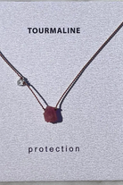 Protection necklace featuring a small, raw pink tourmaline gemstone with tiny herkimer diamond quartz accent bead hand knotted on a durable nylon cord. Finished with a sterling silver spring ring clasp and made to 17". Necklace comes on a pretty card with stone meaning.
