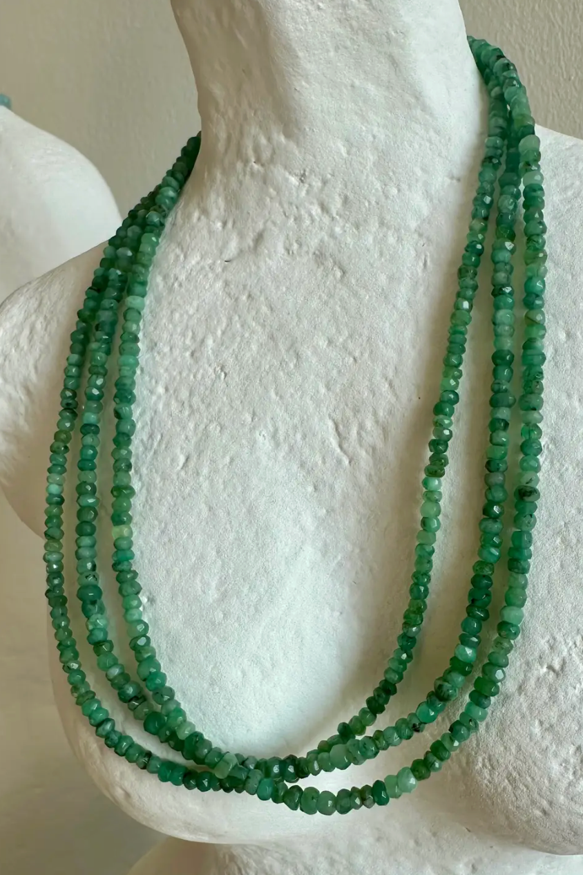 Introducing our stunning Emerald Necklace, crafted with genuine Zambian emeralds. This beautiful beaded necklace features an elegant single green pattern, showcasing unique shading that adds depth and character. The faceted beads catch the light, creating a delicate shimmer.