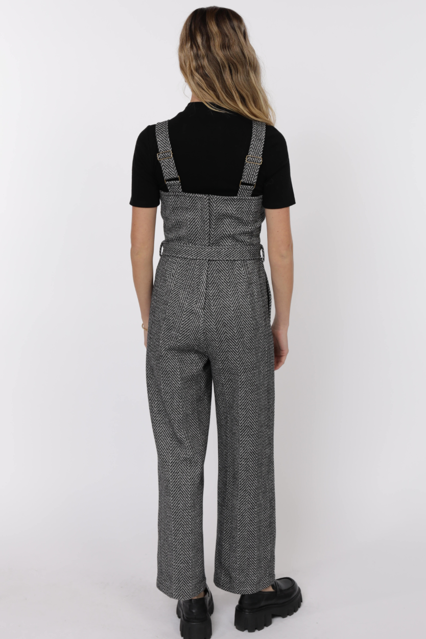 Black and ivory herringbone jumpsuit with adjustable straps and belted front.
