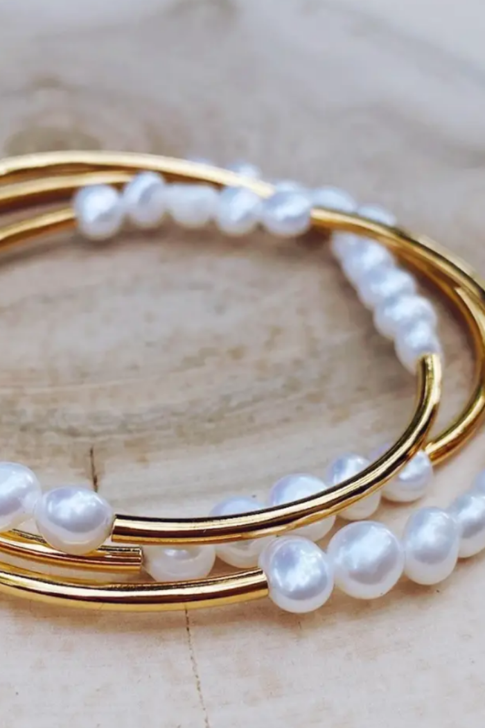 Our Cecelia Hepburn Triple Wrap Bracelet Collection is handmade in Minnesota. You plant one tree with each purchase. These stretchy triple wrap bracelets are made on stretch cord with gold plated beads. One size fits most.