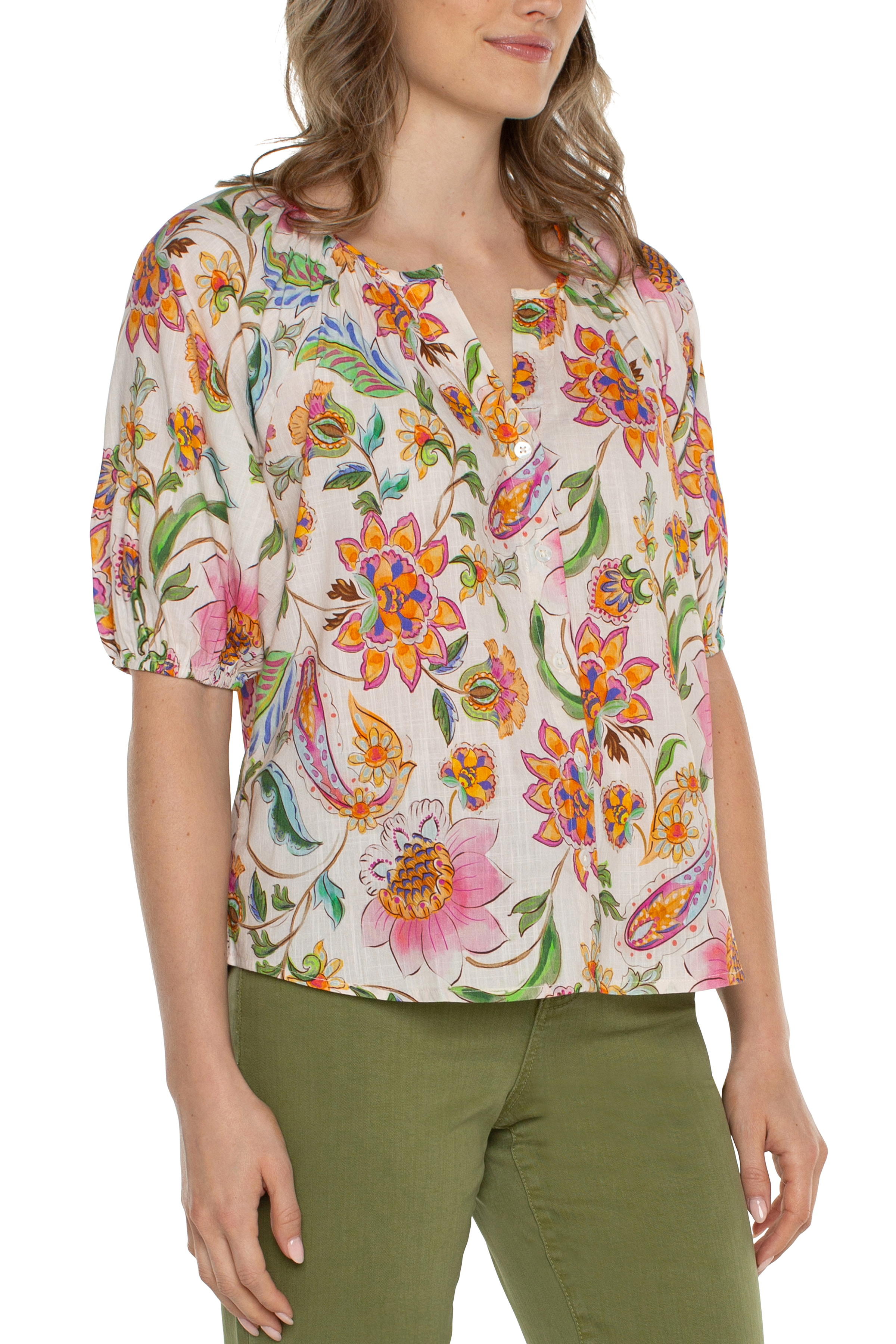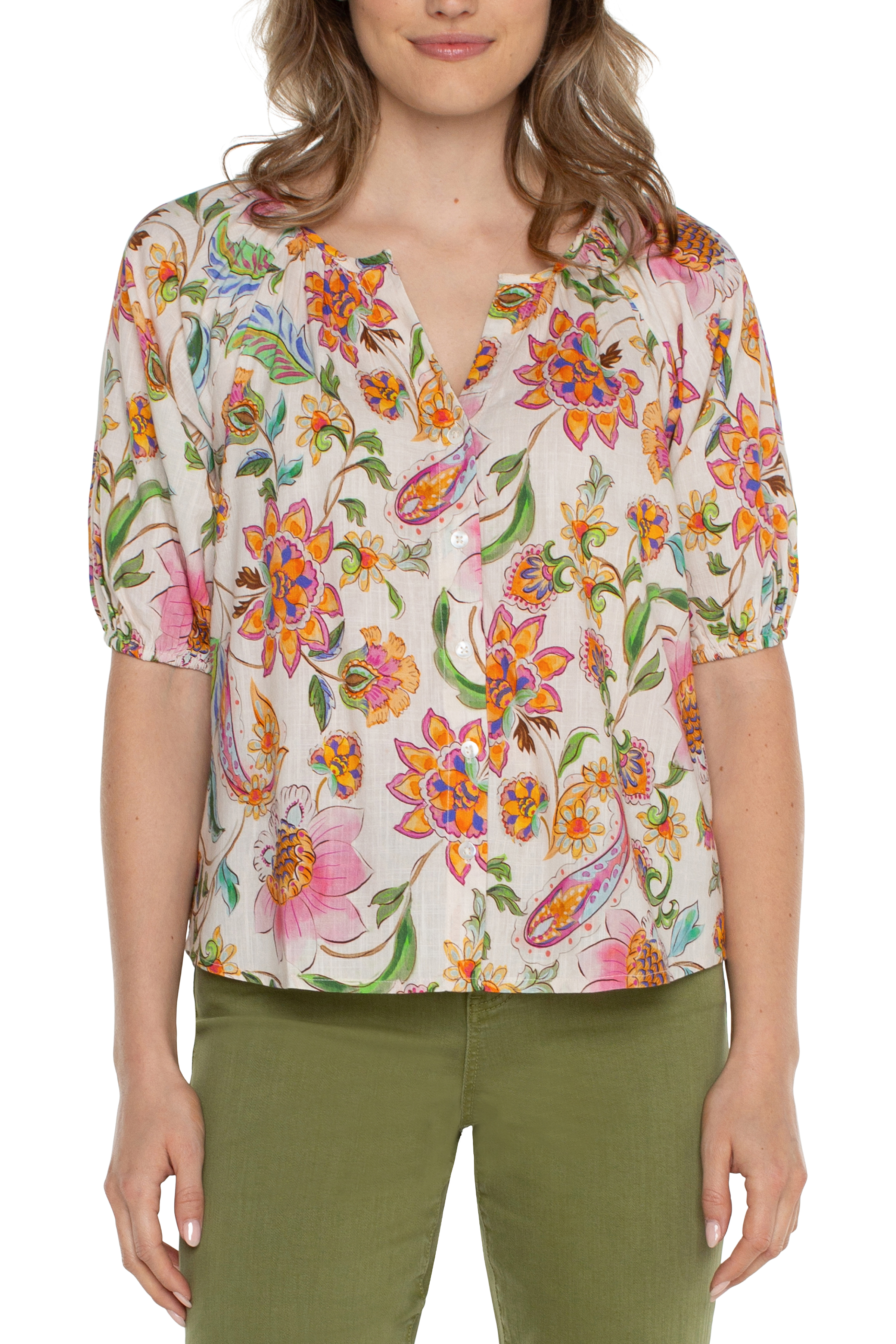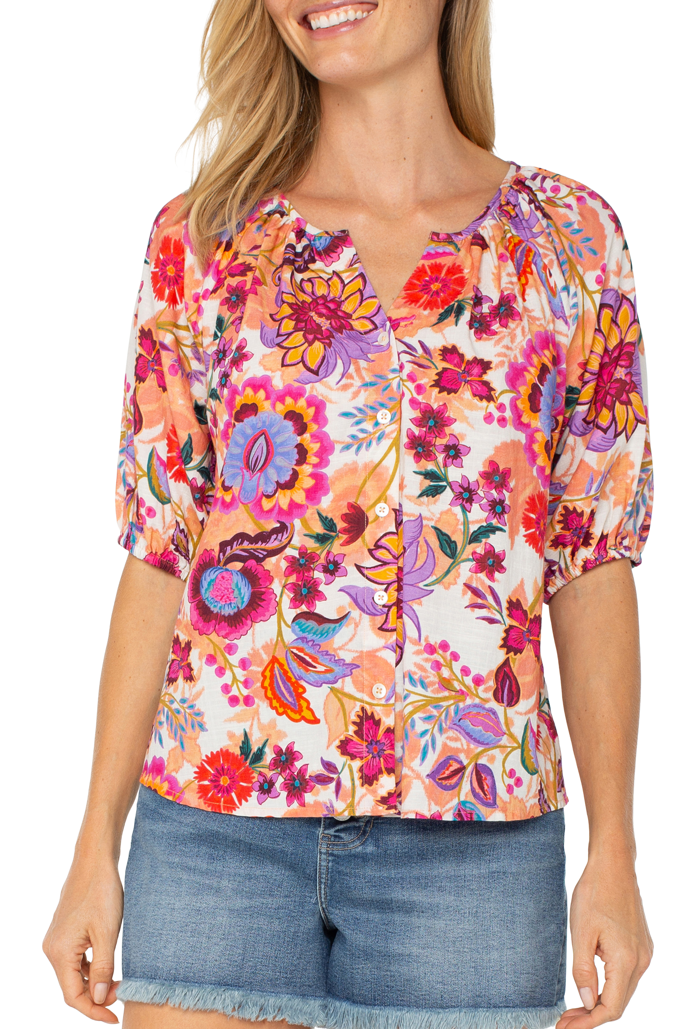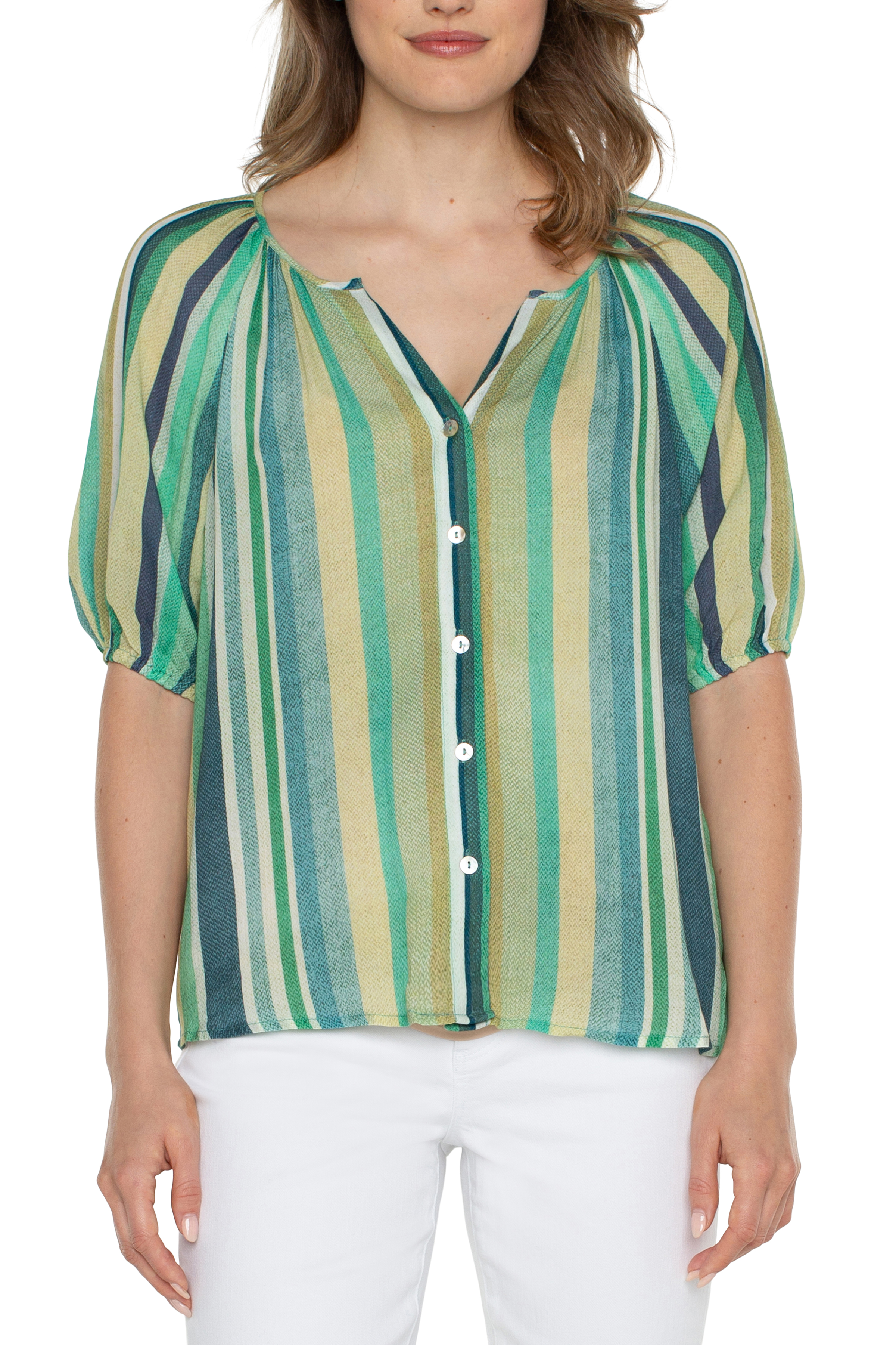 Short Sleeve Button Front Shirred Woven Blouse