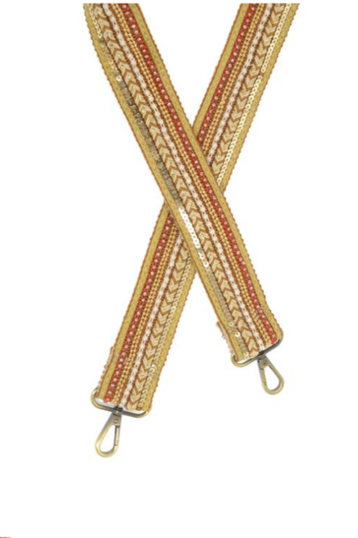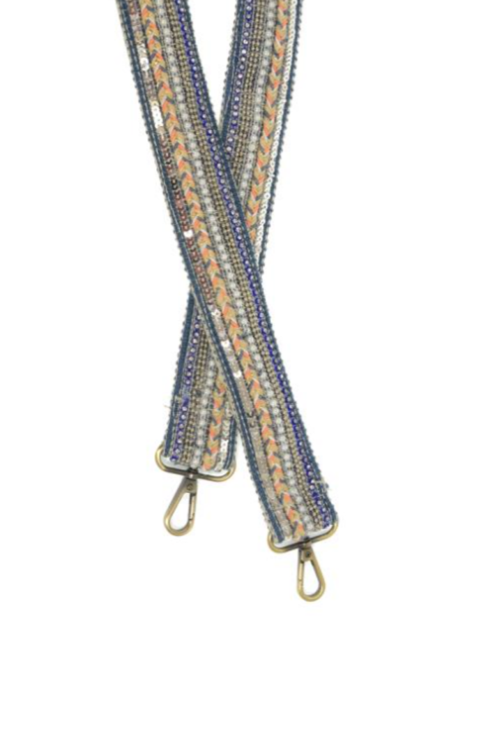 ADD SOME SPARKLE TO YOUR LOOK WITH OUR BEAUTIFULLY BEADED GUITAR STRAP ACCENTED WITH FAUX PEARLS AND BEADS.