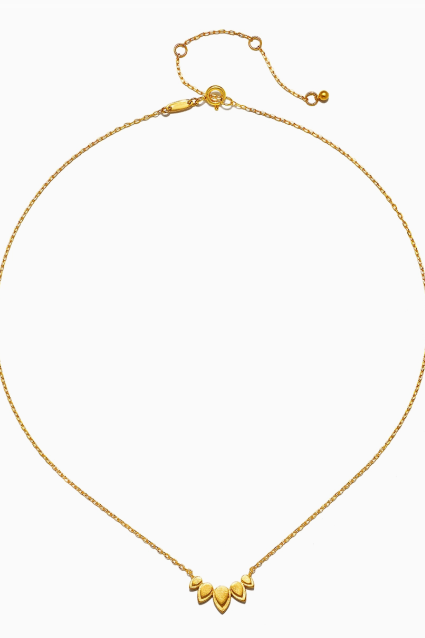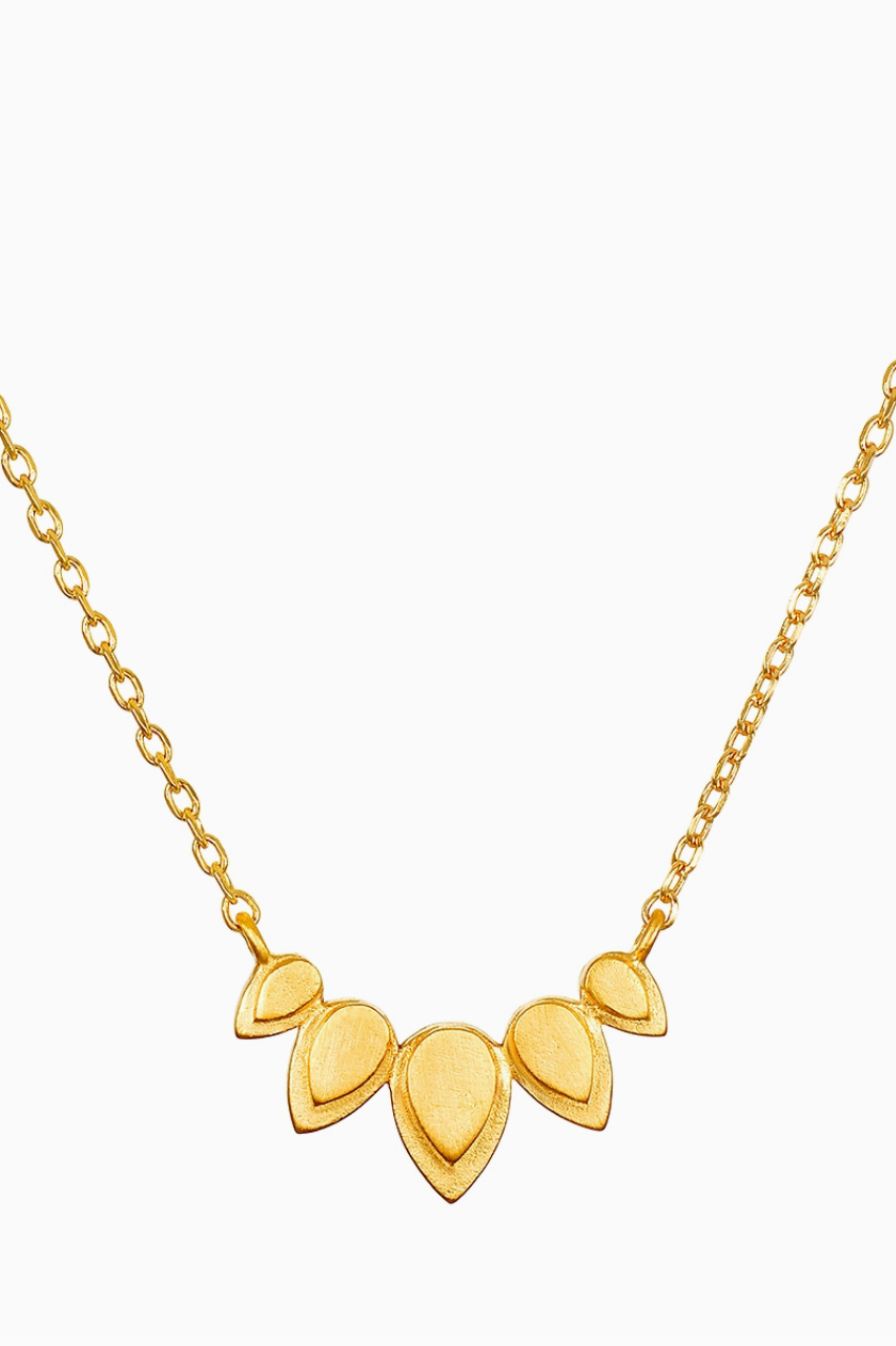 Beauty of Transformation Lotus Petal Necklace - Like the lotus flower rising from the mud to burst into bloom, your personal evolution embodies the beauty of transformation. A gleaming 18kt gold plated necklace shines with five delicate lotus petals, symbols of new beginnings and full potential. Wear this inspiring necklace on its own, or as part of your personalized layered look.