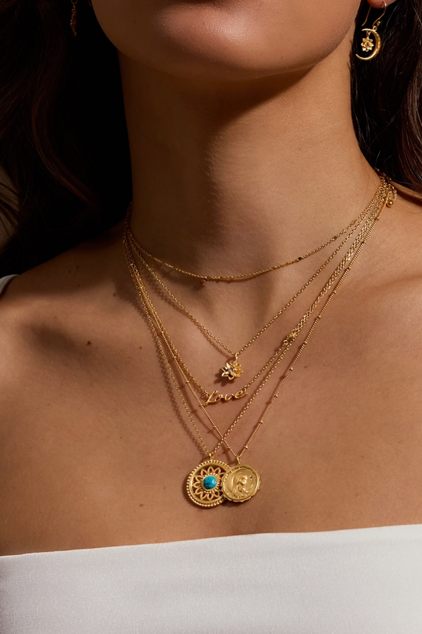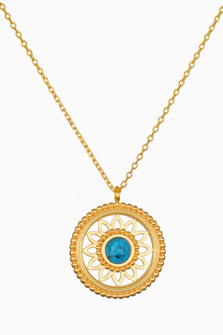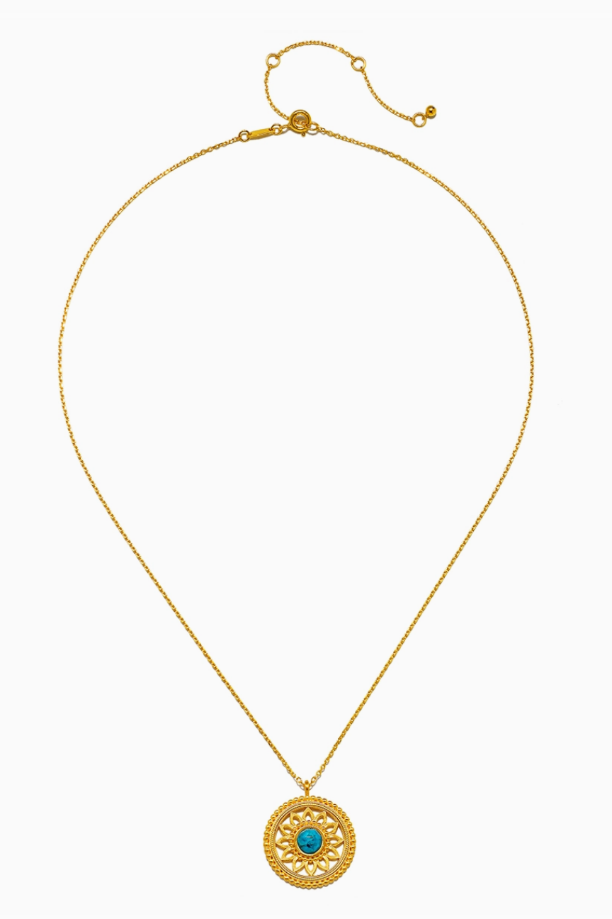 We are born with an innate knowing; a wisdom that whispers when we allow ourselves to listen. Vibrant turquoise—stone of health, intuition, and self-expression—creates a stunning focal point in the center of this necklace in 18kt gold plate. The open-work mandala pendant symbolizes the sacred infinite cycle; wear this 18” necklace to go within and nurture your intuition.
