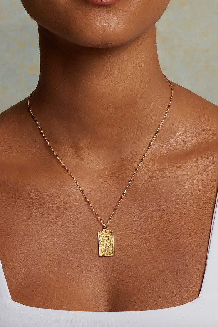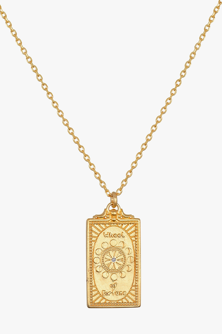 When the Wheel of Fortune—a Major Arcana in most Tarot decks—appears upright in a tarot reading, it represents change to a current fortune or standing. This 18kt gold plated Tarot pendant necklace is graced with a gleaming wheel, a reminder that like the wheel itself, our fortunes and blessings can turn around at any moment.