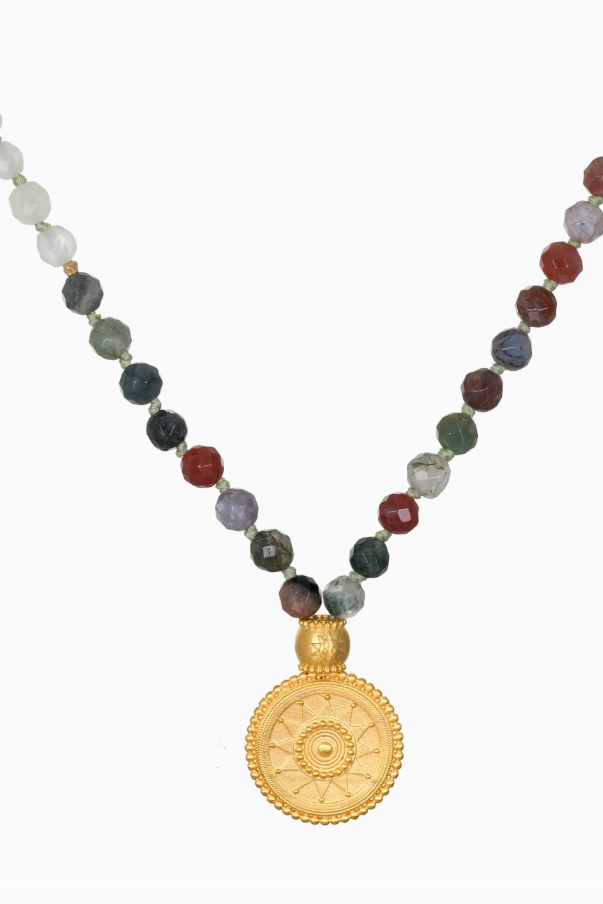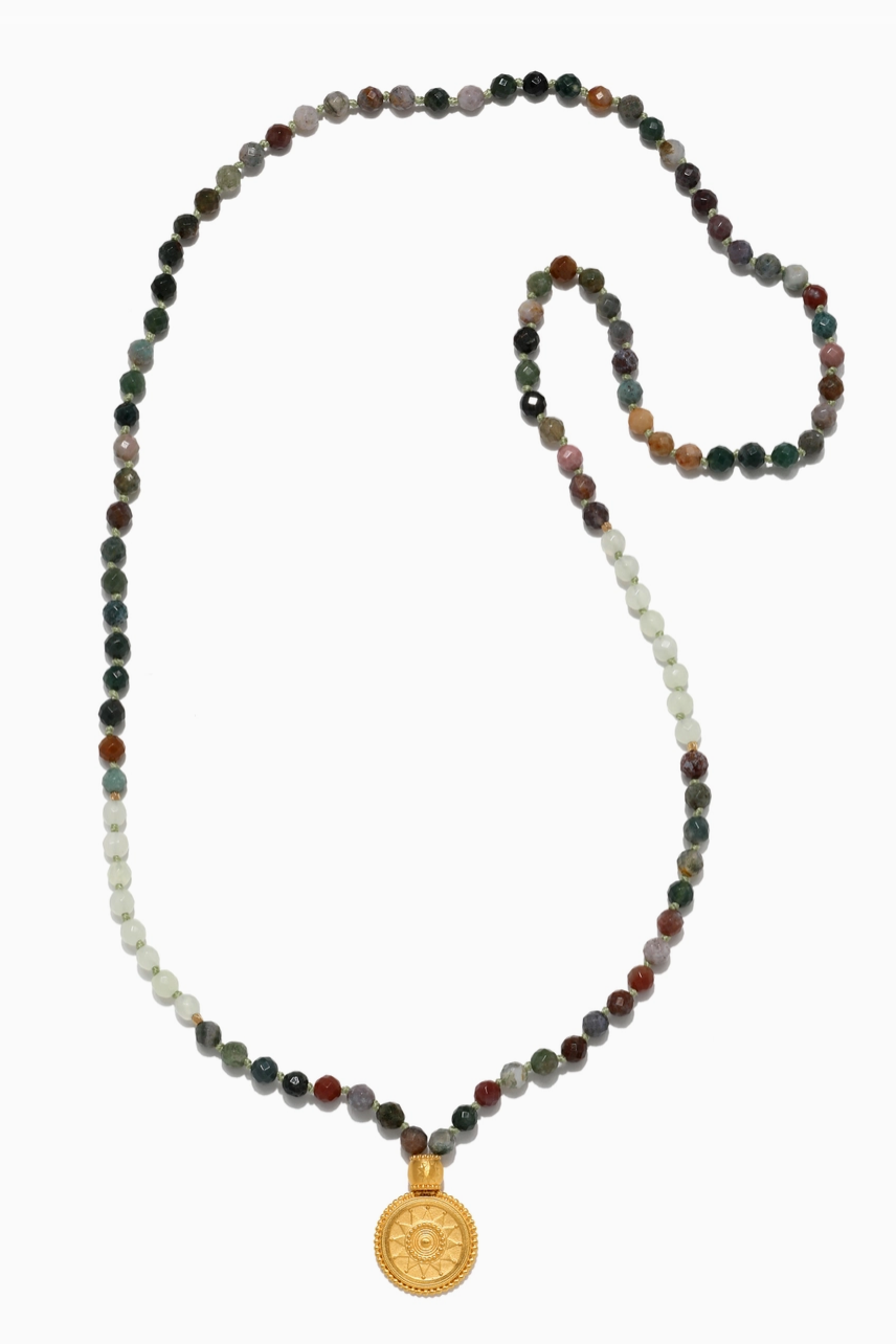 Beacon of Creativity Fancy Jasper Celestial Mala - Follow the flame of inspiration and let it serve as your beacon of creativity. A hand-beaded mala—or ancient prayer necklace—of 108 fancy jasper beads lends focus, creativity, and grounding to its wearer. Anchoring this mala is a shining golden coin engraved with a brilliant sun, symbol of leadership and vitality. Wear this mala as a necklace, or use it as an integral part of your meditation and manifestation practices.