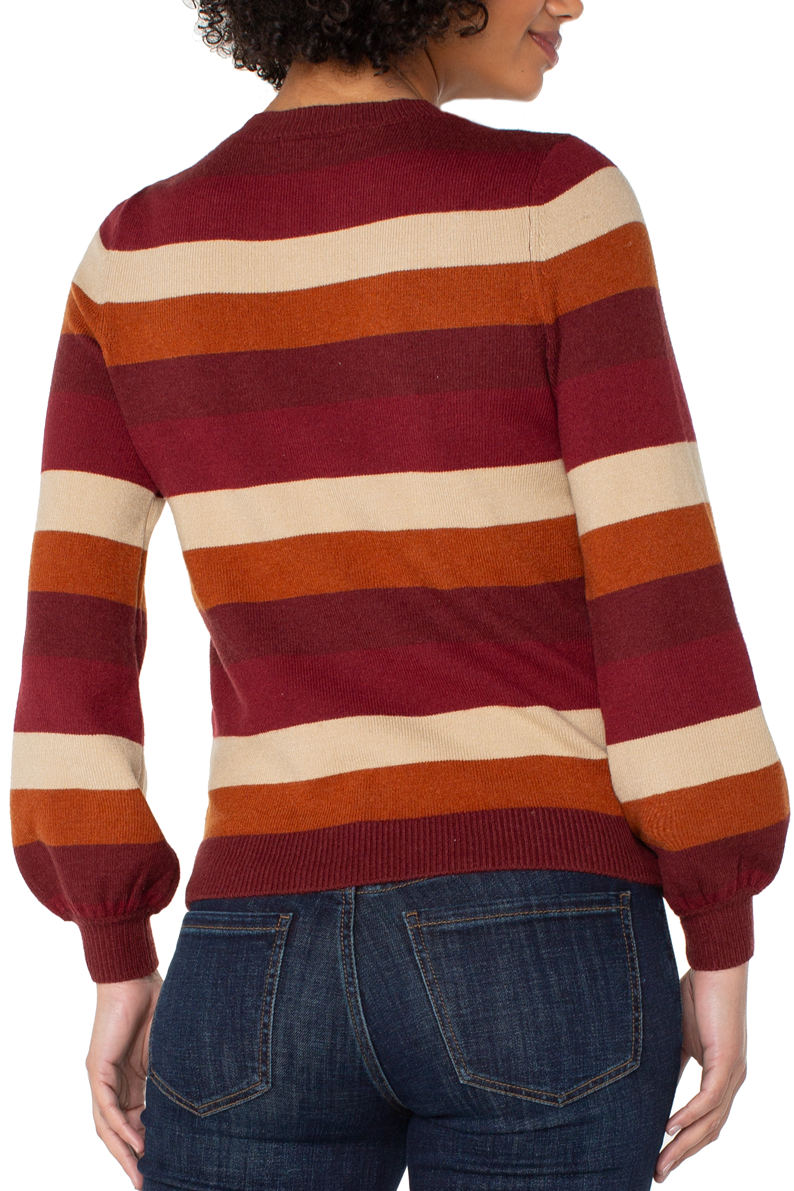 Crew neck with bold color stipes. Soft and casual fit. Pair with jeans or dress pants.