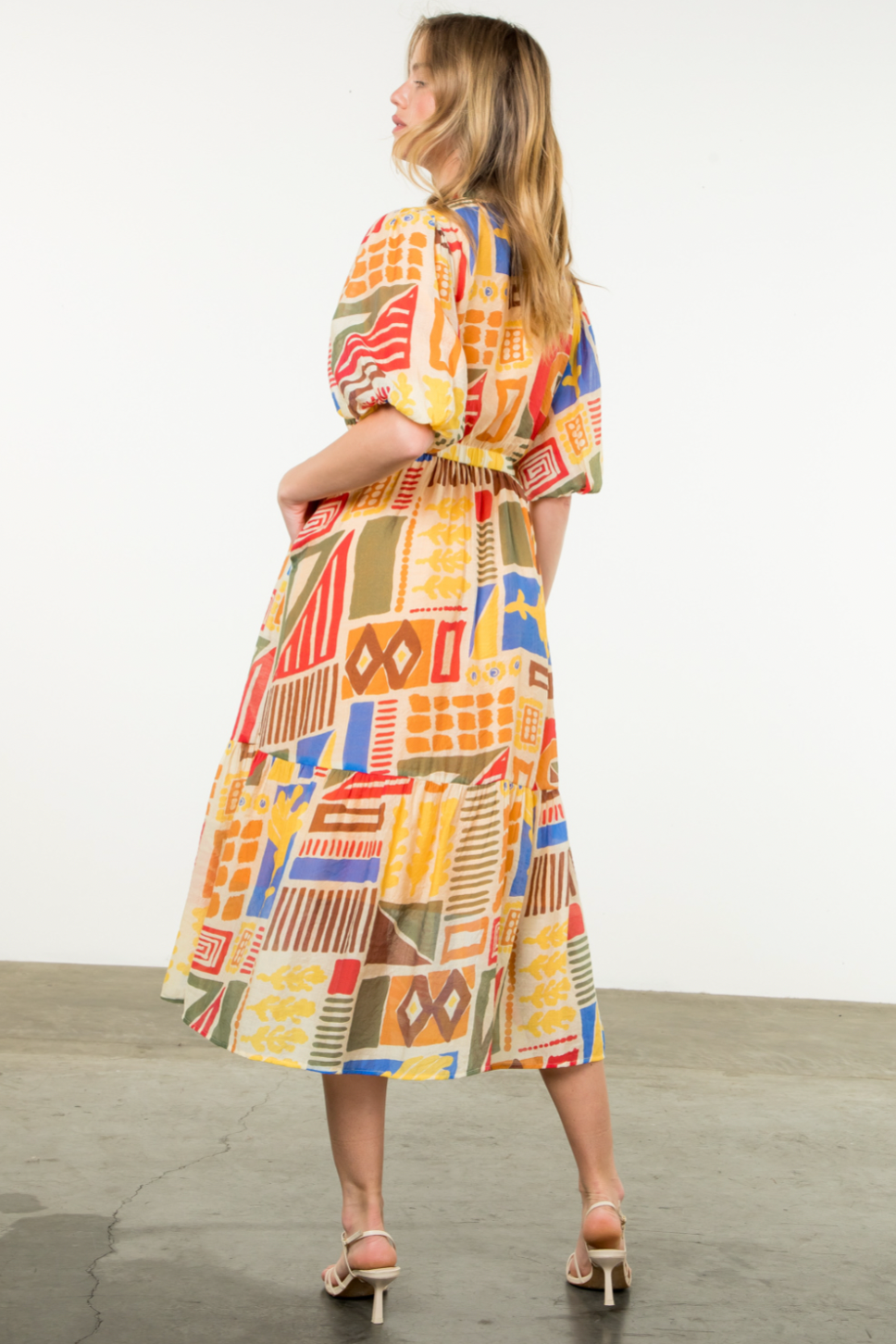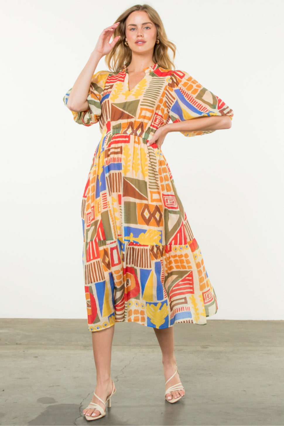 Colorful fall dress in an abstract print with a v-neck, elastic waist and easy puff sleeve. This is a customer favorite!