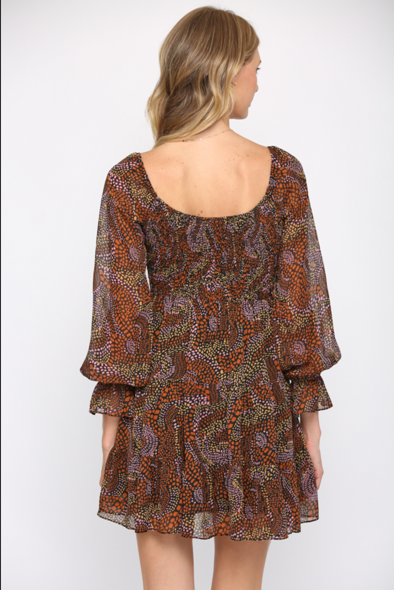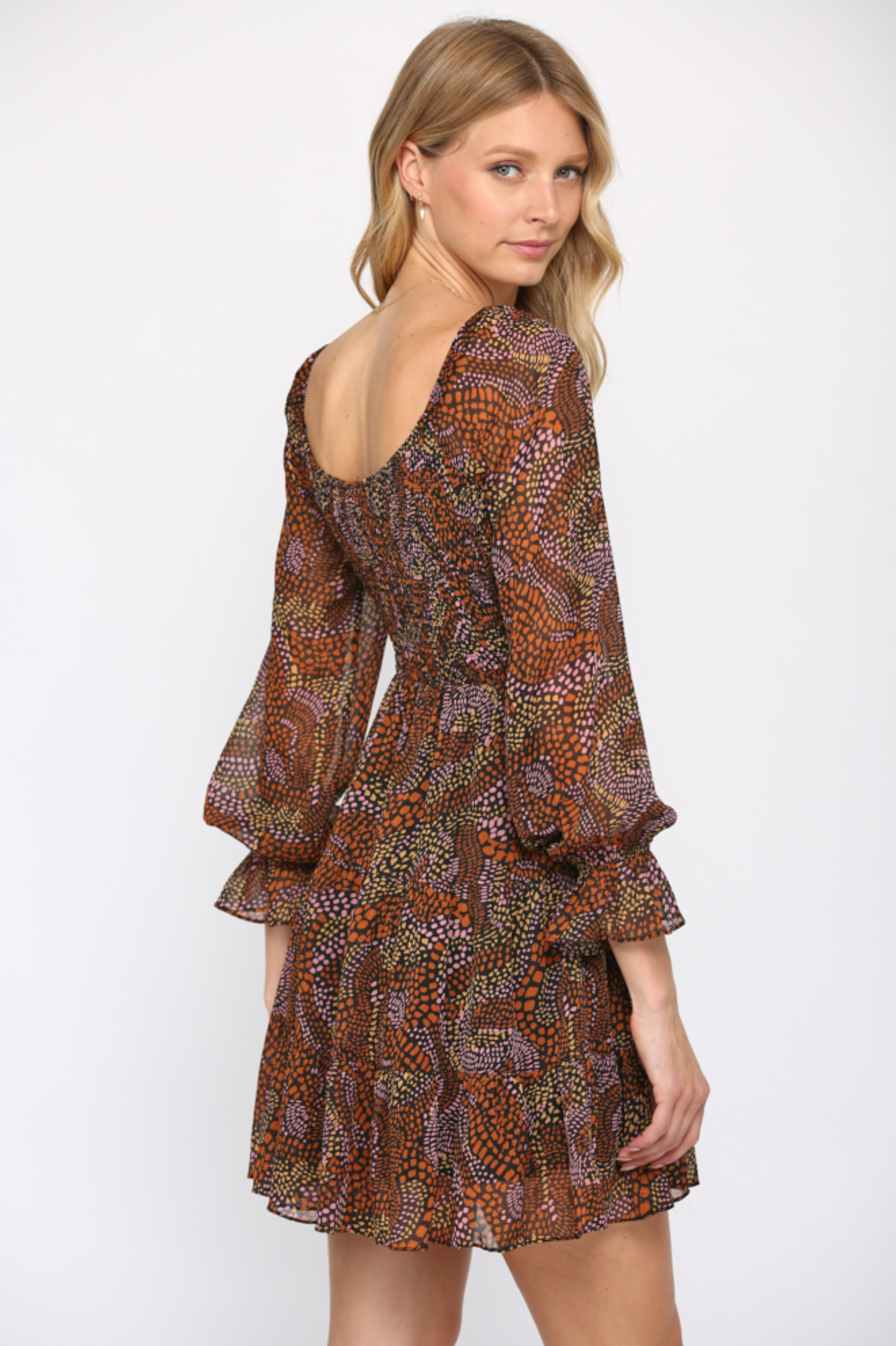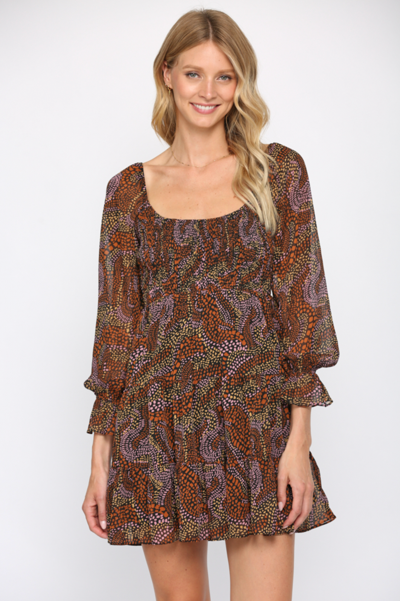 This abstract print dress matches any boots you have. Looks great with tall boots and makes for a great GNO outfit.