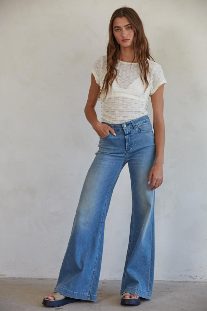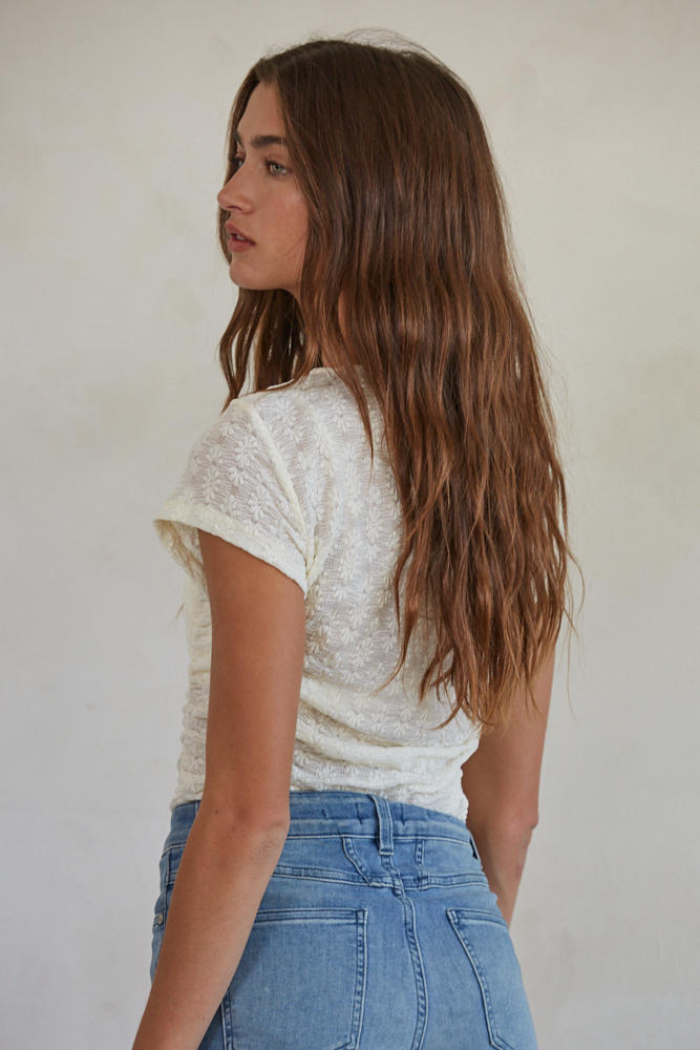 Knit Polyester Spandex Floral Lace Side Ruched Detail Round Neck Short Sleeve Top