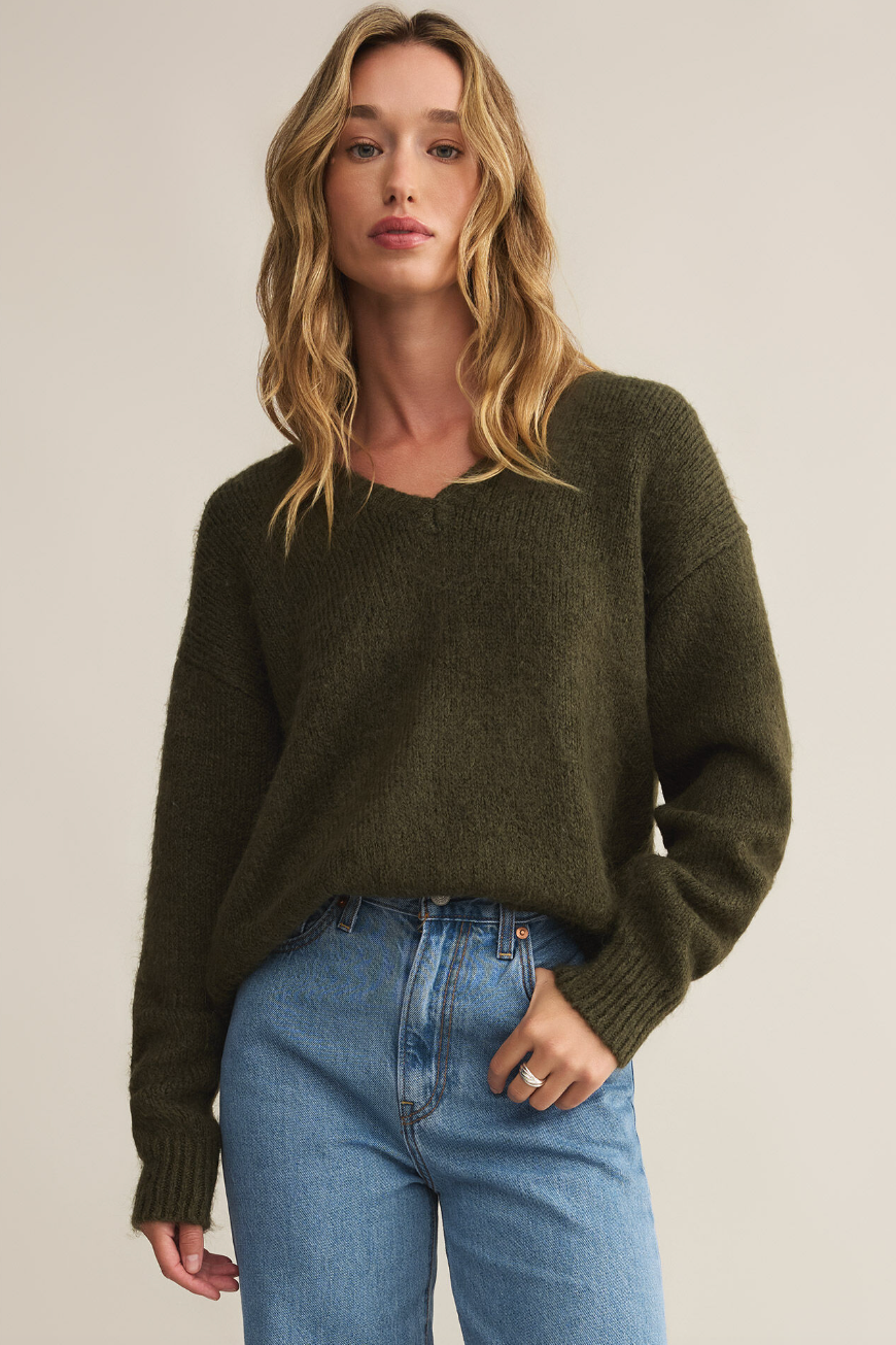 Indulge in cozy elegance with this v-neck sweater, made from luxuriously soft mohair yarns. Featuring long sleeves and a slouchy fit, it's the ultimate piece for relaxed, effortless charm.
