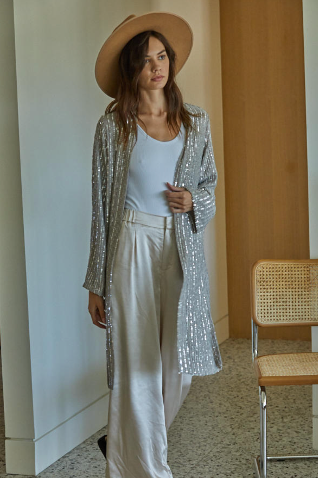 This long sleeve sequin cardigan is great for the holidays. Easy to throw on over a plain outfit for a statement piece.