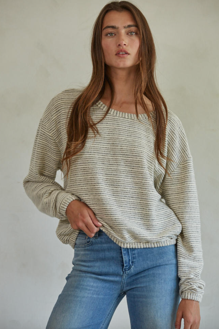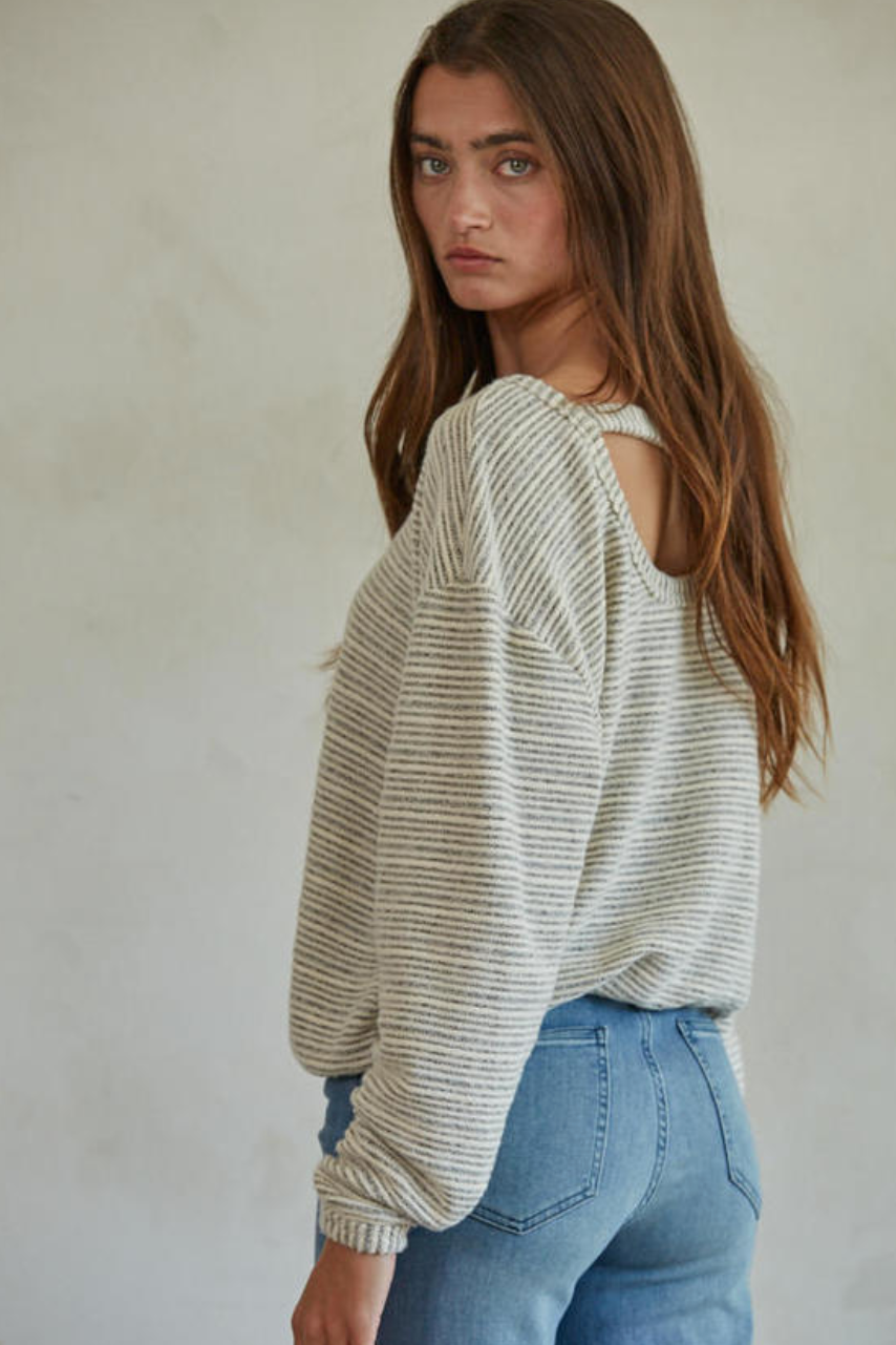 Knit Polyester Rayon Spandex Striped Round Neck Long Sleeve Pullover Top With Open Back Detail
