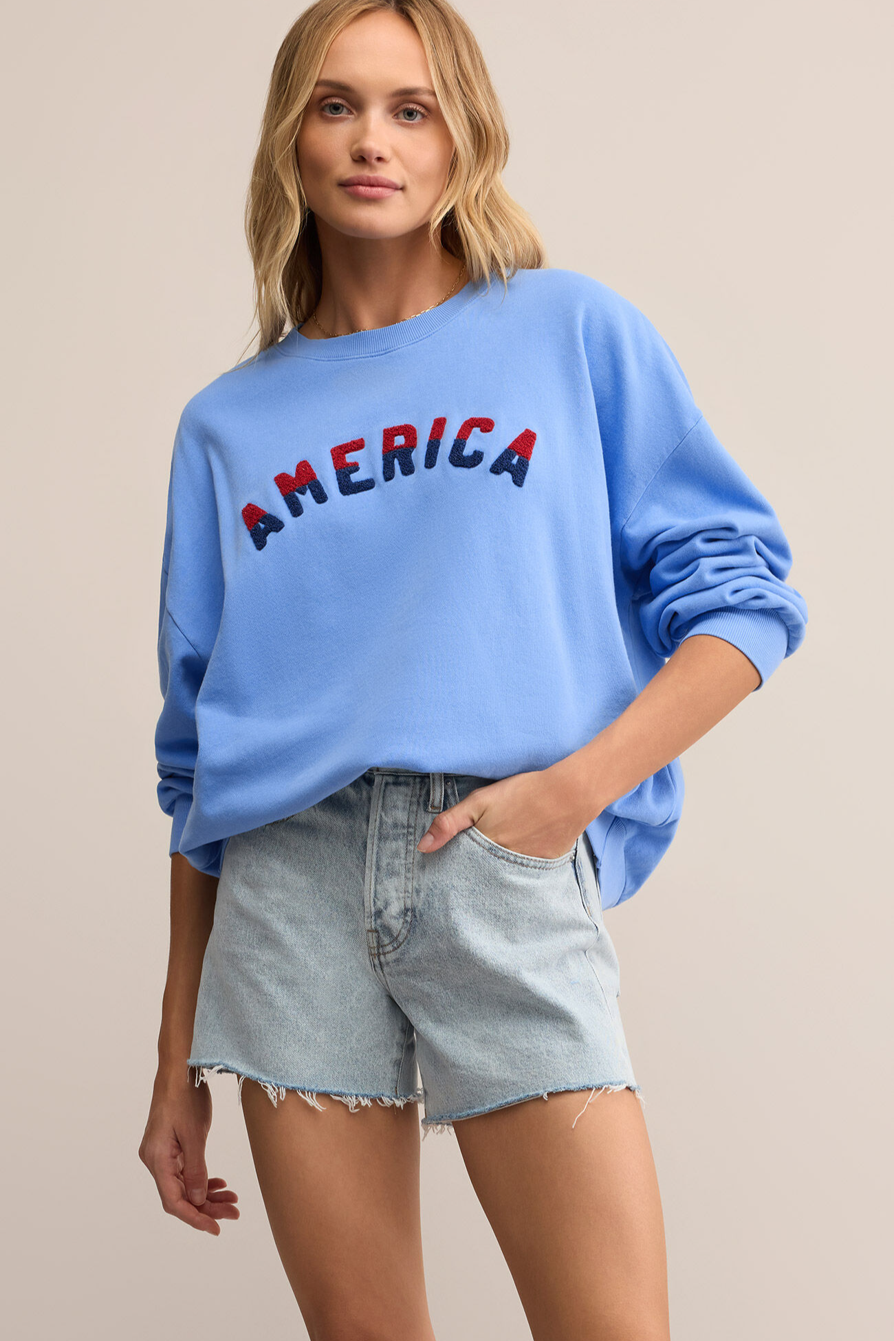 Go for that laid-back, classic vibe with this ultra-cozy oversized sweatshirt. Featuring bold red and blue "America" screen print lettering and crafted from soft, brushed cotton fleece, it’s the easy layer you’ll reach for year-round.