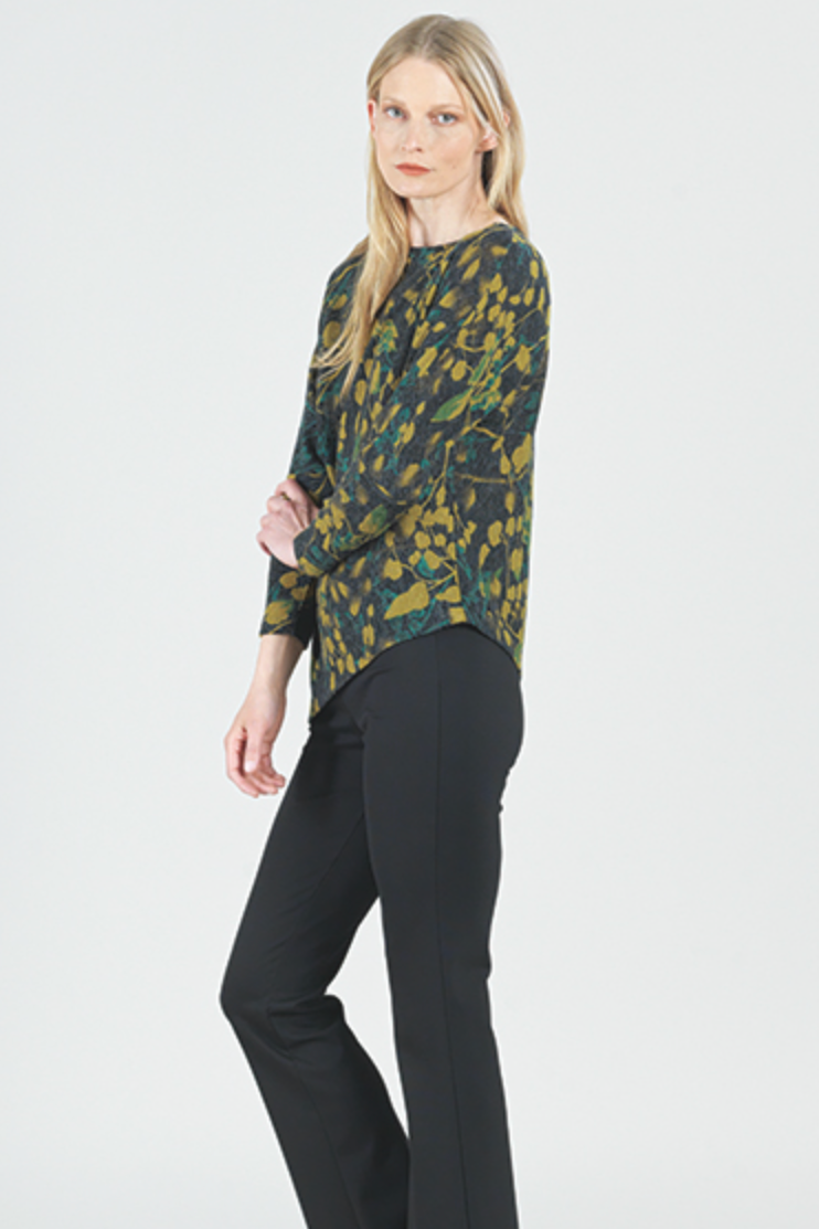 A print displaying olive leaf branches in shades of olive and forest green, encompassed by hues of teal, against a black sweater background.