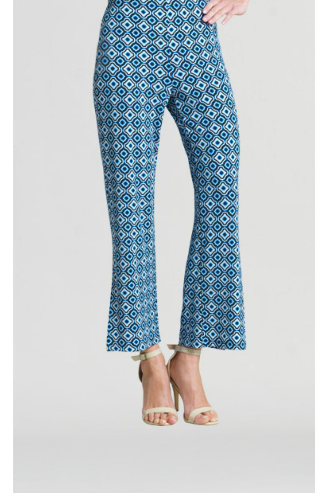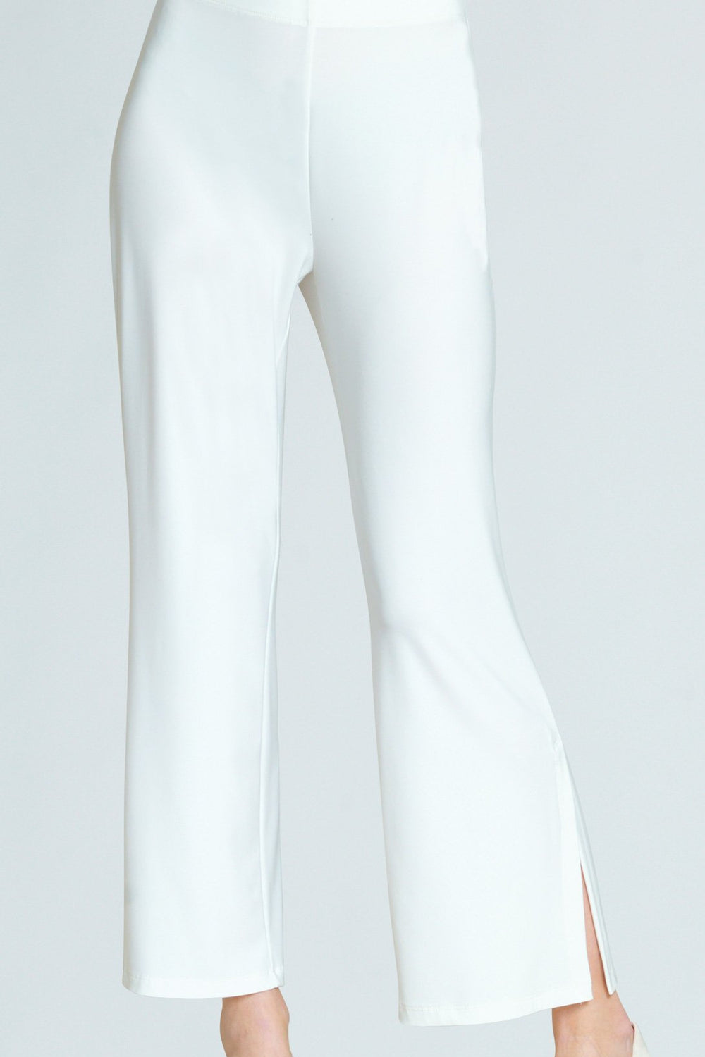 This stylish pant features a 1” pull-on elastic waistband, straight leg with flared hem and side ankle slit.