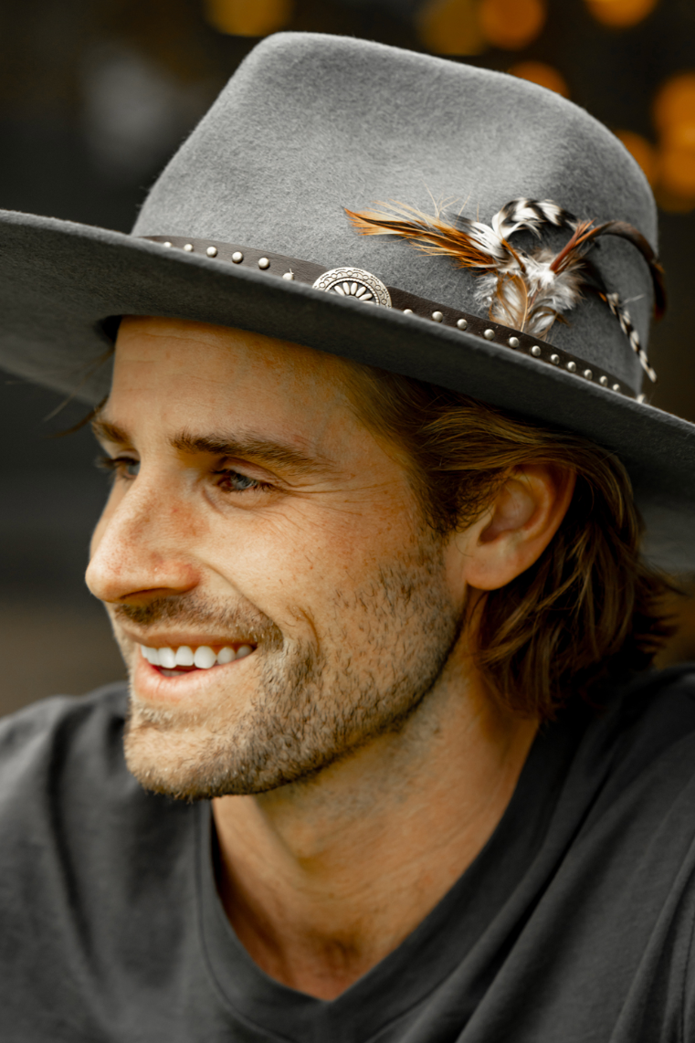 This apache hat is perfect for fall. The faux studded leather band shows off faux turquoise conch. Unisex