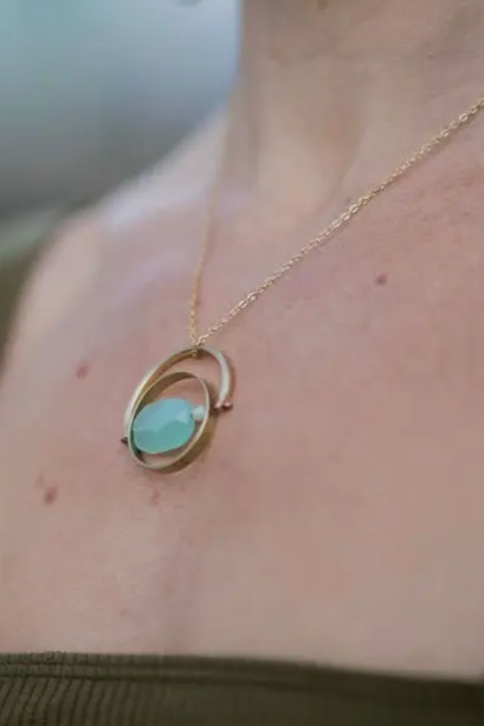 This semi translucent, pale blue chalcedony exudes a calming, ethereal quality, while the brass components are artfully crafted to create a kinetic effect, allowing the pendant to sway gently with every motion. The interplay of smooth stone and dynamic metalwork creates a harmonious balance of elegance and energy, making this piece a standout. The whole piece is roughly 1.5 inches diameter with 17 inch brass chain.