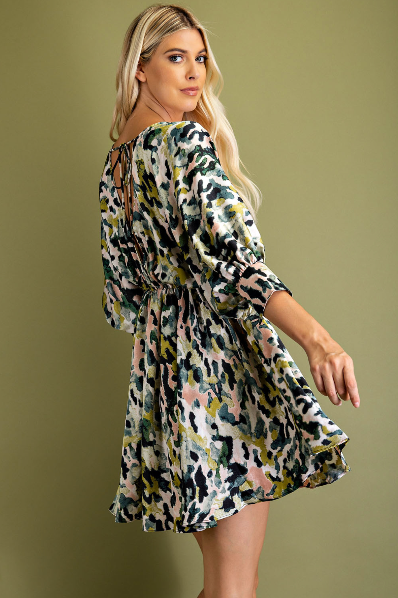 This olive print dress is a great pop of color for Fall. Looks great with brown or black boots.