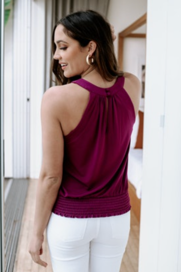 This high neck blouse is super flattering and the color is great for summer. The banded bottom makes it easy to wear anywhere on the body to imitate a tucked-in look.