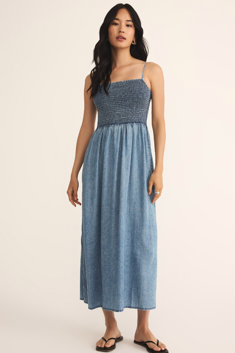This effortlessly chic chambray midi dress features a smocked bodice that flatters the silhouette, paired with thin adjustable spaghetti straps for a light and airy feel. The gathered skirt falls to a breezy midi length, offering comfort and ease with every step. This dress blends casual elegance with timeless simplicity -- perfect for warm-weather outings, weekend brunches, or relaxed summer getaways.