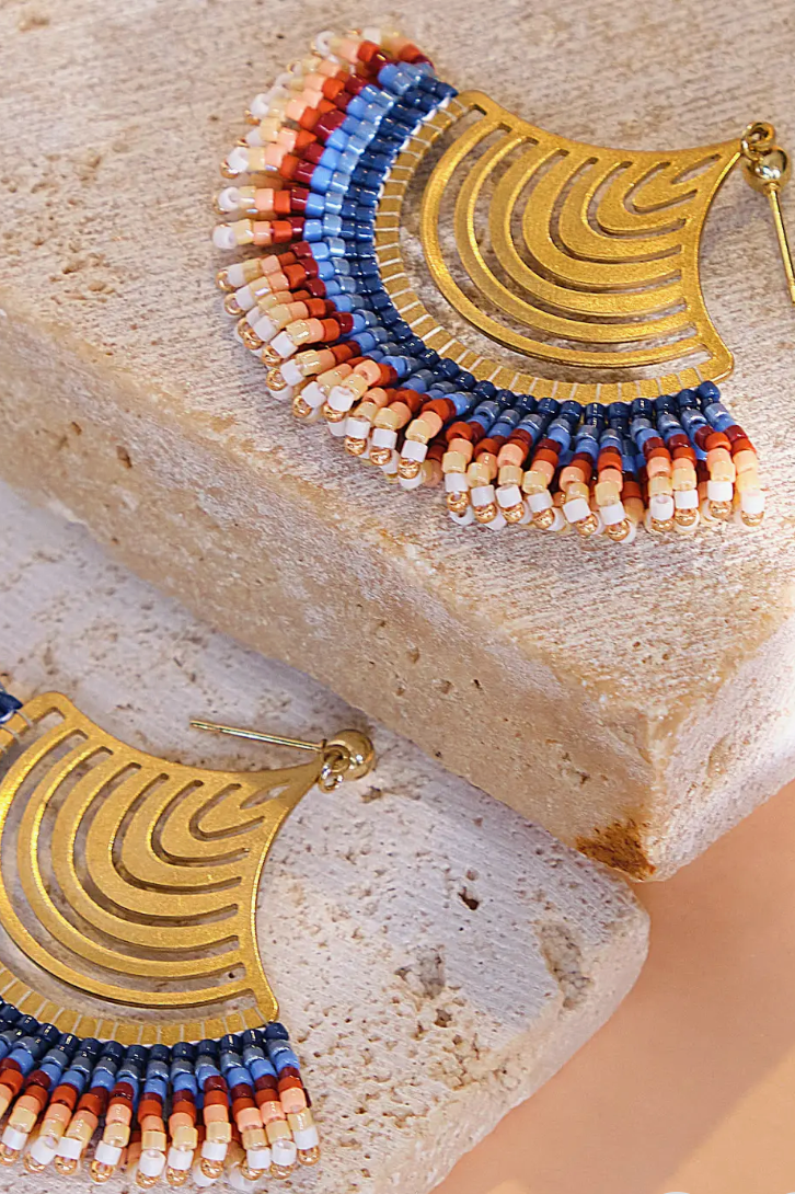 These vibrant earrings combine ruffle-like looping beadwork reminiscent of Spanish flamenco costumes with a beautiful fan-like brass component. Each version of this earring utilizes bold ombre color combinations and is accented with miniature gold beads for added shimmer. The brass component is hung from a stainless-steel ball earring post in such a way that the fan hangs sideways facing the neck. Comprised of the highest quality Japanese Miiyuki glass beads, these earrings have an exotic and bohemian feel and are perfect as temperatures warm.
