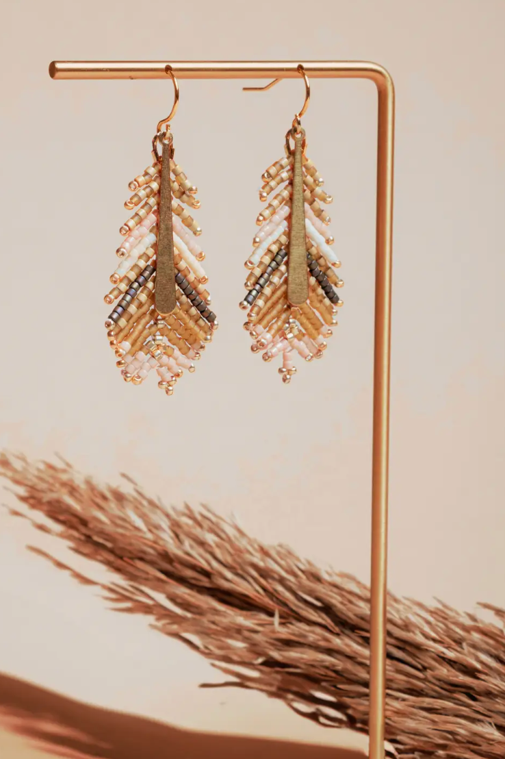These truly unique earrings are skillfully crafted with premium Japanese Miyuki glass beads which are handwoven to create a delicate feather form. Speckled with gold beads and adorned with a brass charm, these earrings are perfect to use every day or for a special occasion. They are extremely lightweight and comfortable to wear. The earrings are hung from gold-plated ear wires fitted with a silicone backing for security.