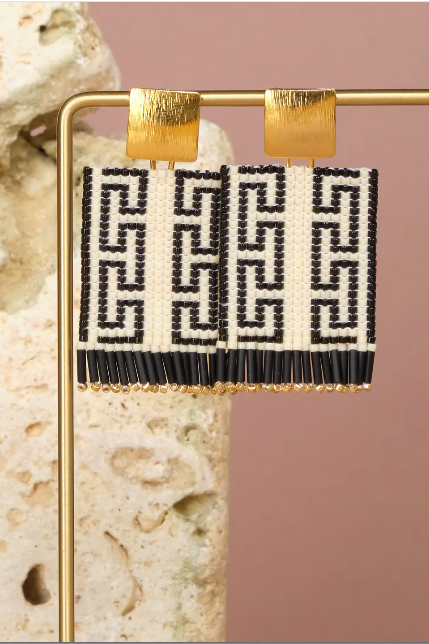 These handwoven Miyuki glass beaded earrings feature a bold geometric pattern which contrasts against the background color. Adding to their uniqueness is the tubular fringe hung from the bottom of the woven square with accenting gold beads at the tips. This a classic but elegant design that can easily transition from day to night and from season to season making it a staple in one's accessory collection.