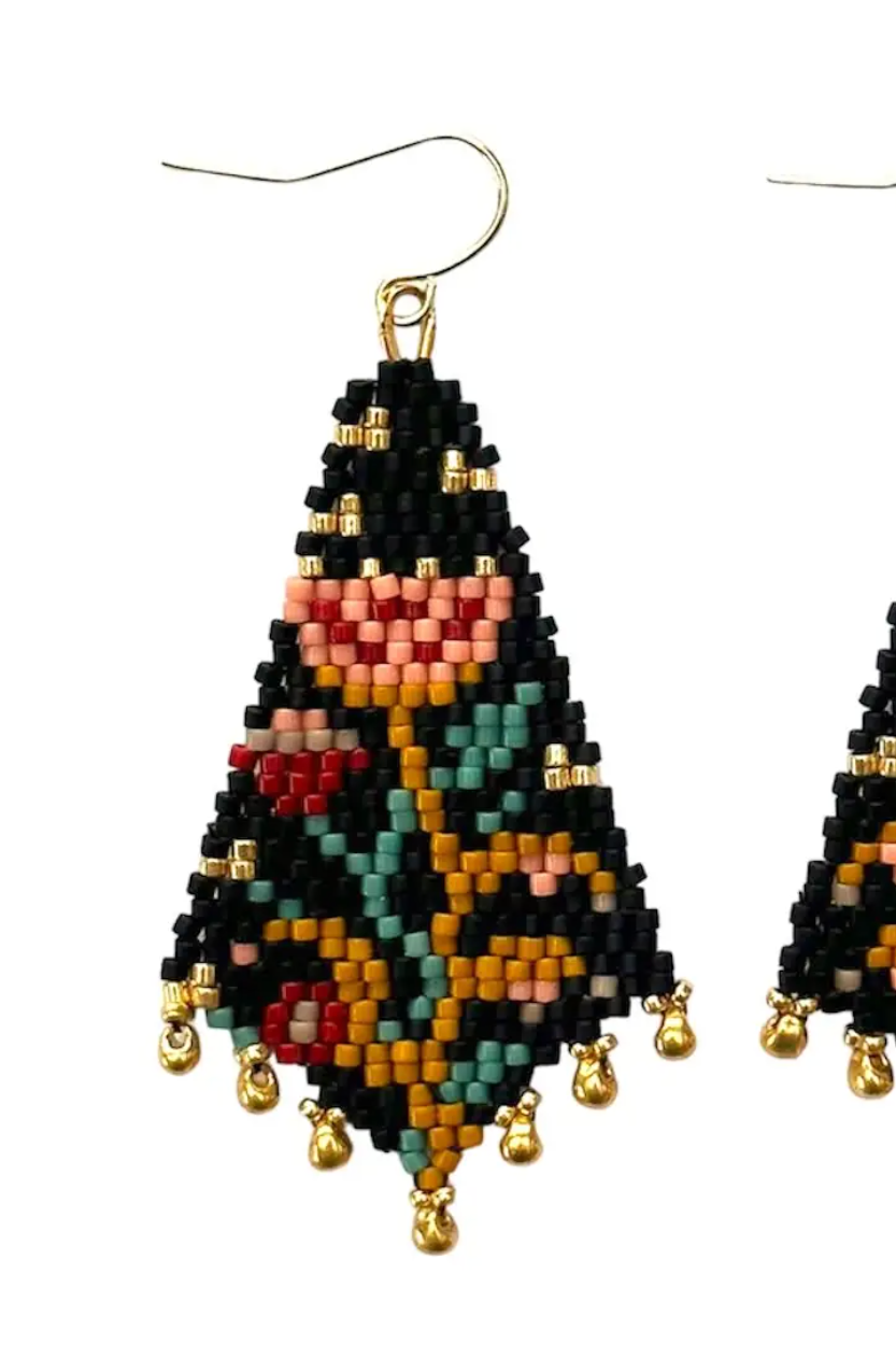 These drop earrings feature a striking and original floral design made from handwoven glass beads sewn together one bead at a time. The background color contrasts perfectly with the flower/leaf design to bring these night blooms to life. Accenting the bottom of the earring are gold drop beads which give the earring an elegant touch. The beaded portion of the earring is hung from a gold-plated ear wire.