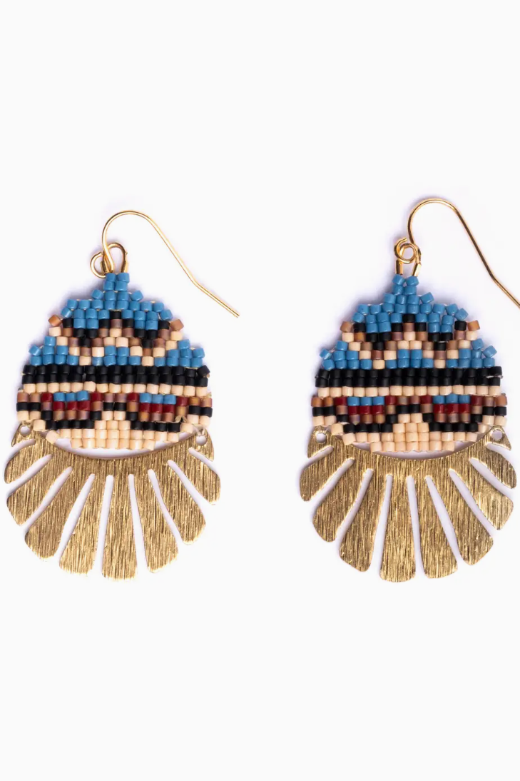 These skillfully crafted earrings feature premium Japanese Miyuki glass beads handwoven into a beautiful geometric pattern. The drop earring is adorned with a striking brass charm. These versatile lightweight earrings are a perfect everyday earring given their size but will still make an impact with their unique design and color combination. The earrings are hung from gold-plated ear wires fitted with silicone backings for security.