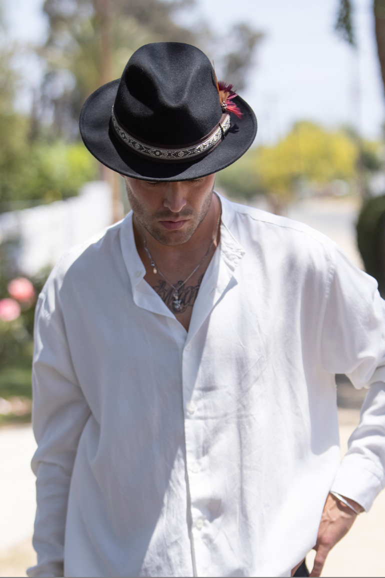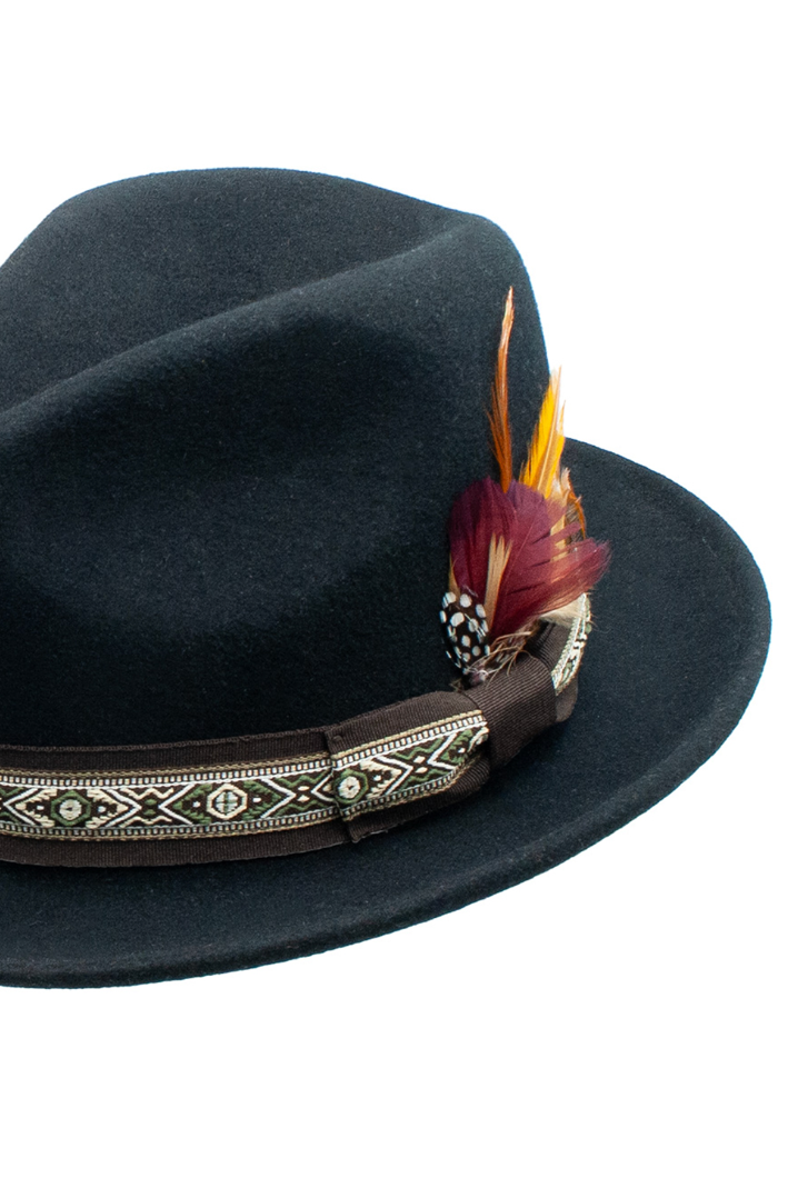 Black fedora with brown, taupe and olive ribbon band. Feather details finish off this striking hat. Perfect for men and women.
