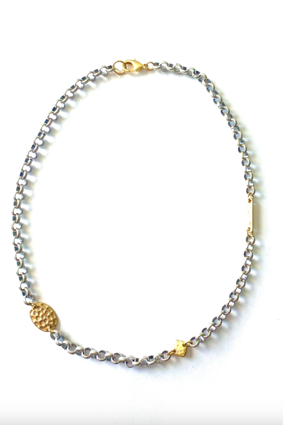 Wear this necklace with just about anything in your closet. Loving the rolo chain mixed with hammered accent pieces.