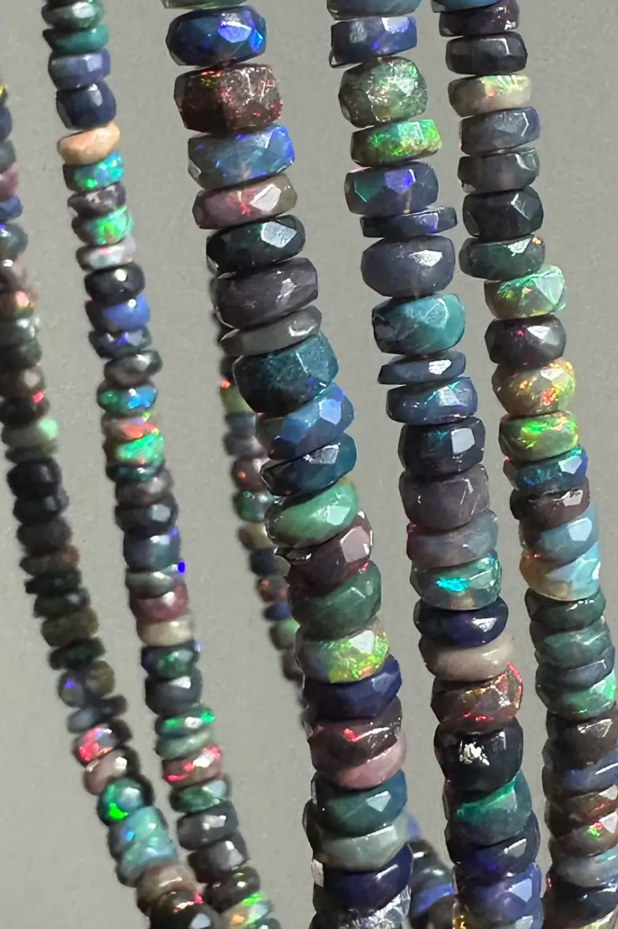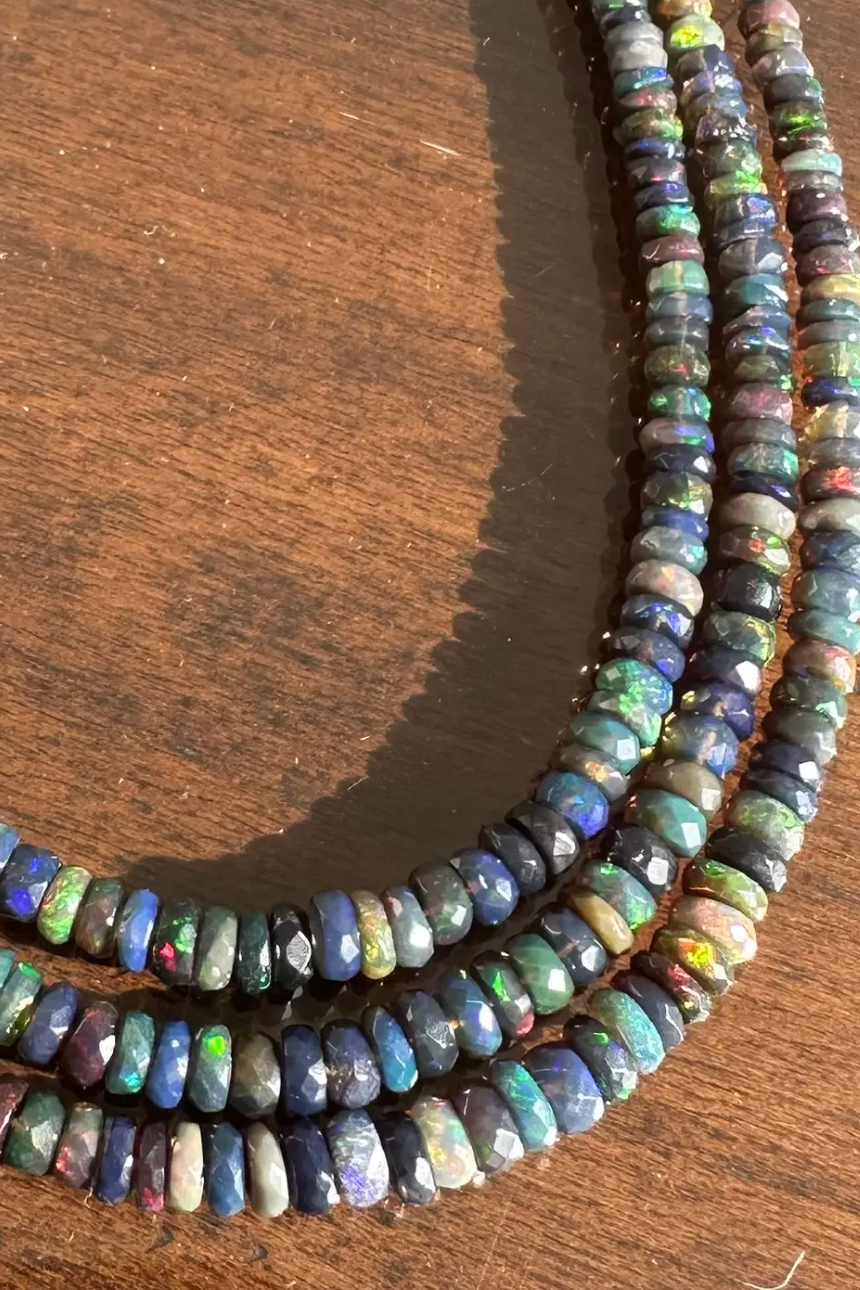 Stunning Black Opal! This high-fire faceted Ethiopian Opal necklace has 3.5-5.5 mm graduated beads. These gemstone beads are full of fire and so gorgeous in natural light!