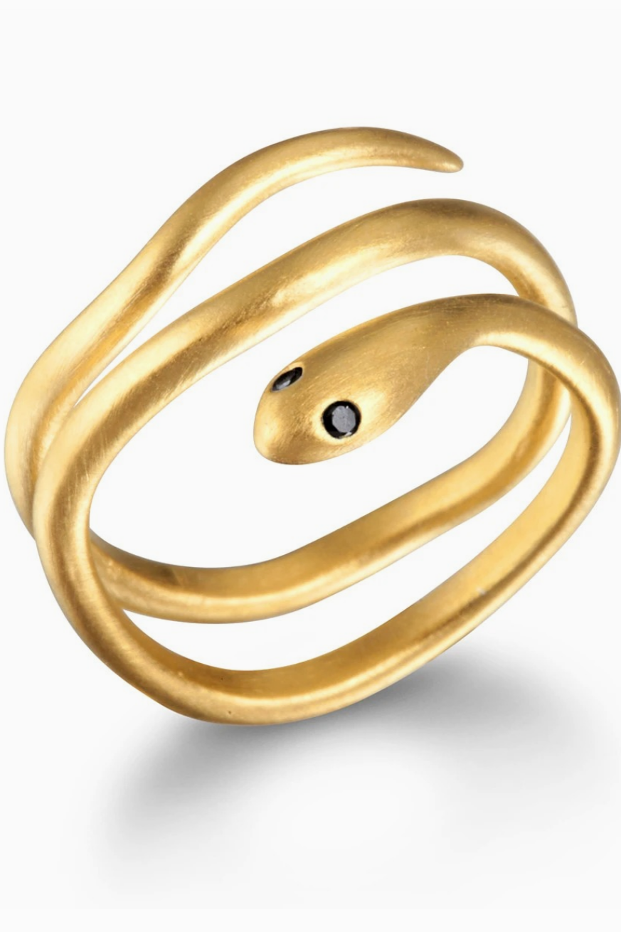 Wrap your finger in one of nature's most elegant creatures with our coiled serpent ring. Featuring black eyes, the ring has just the right amount of sparkle.