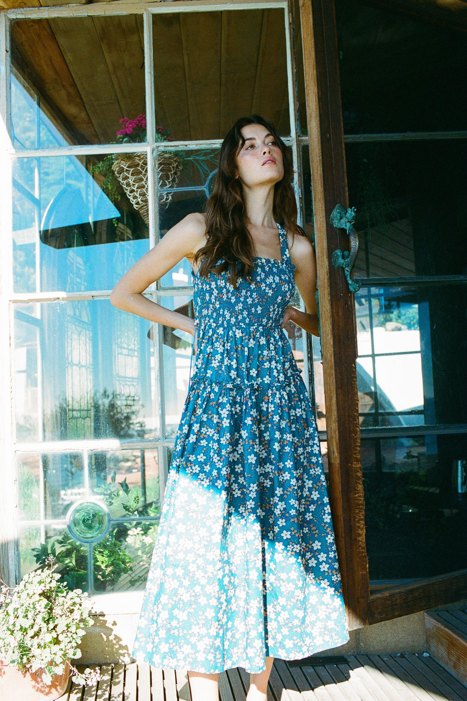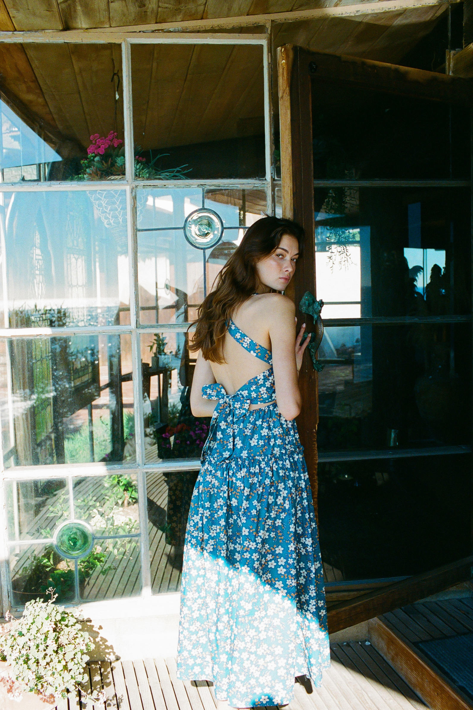 Woven Cotton Floral Print Open Back With Tied Strap Square Neck Tiered Maxi Dress With Lining