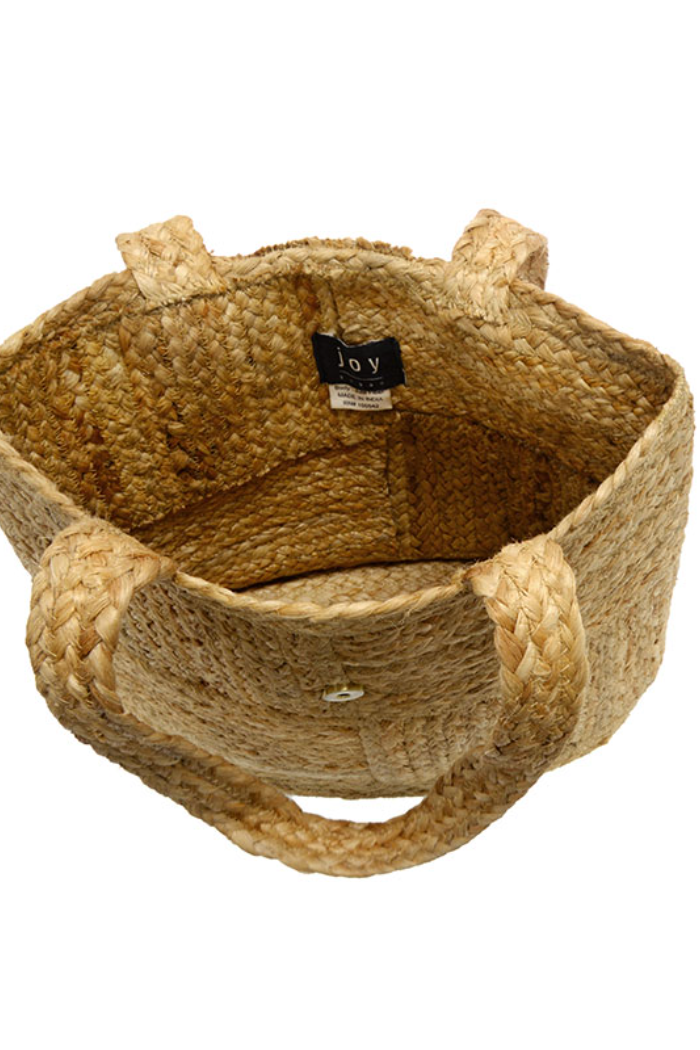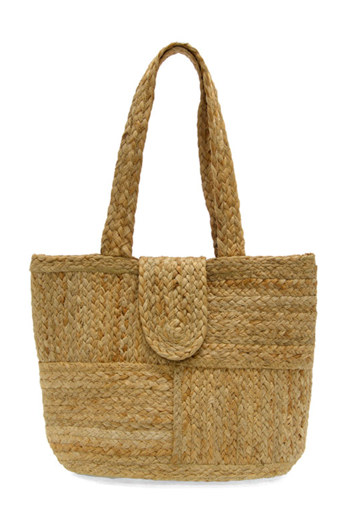 This all-natural jute tote in a cute shopper size has textural interest with patchwork detailing. Closed with a magnetic snap under the flap, your belongings will be safe & secure this summer.