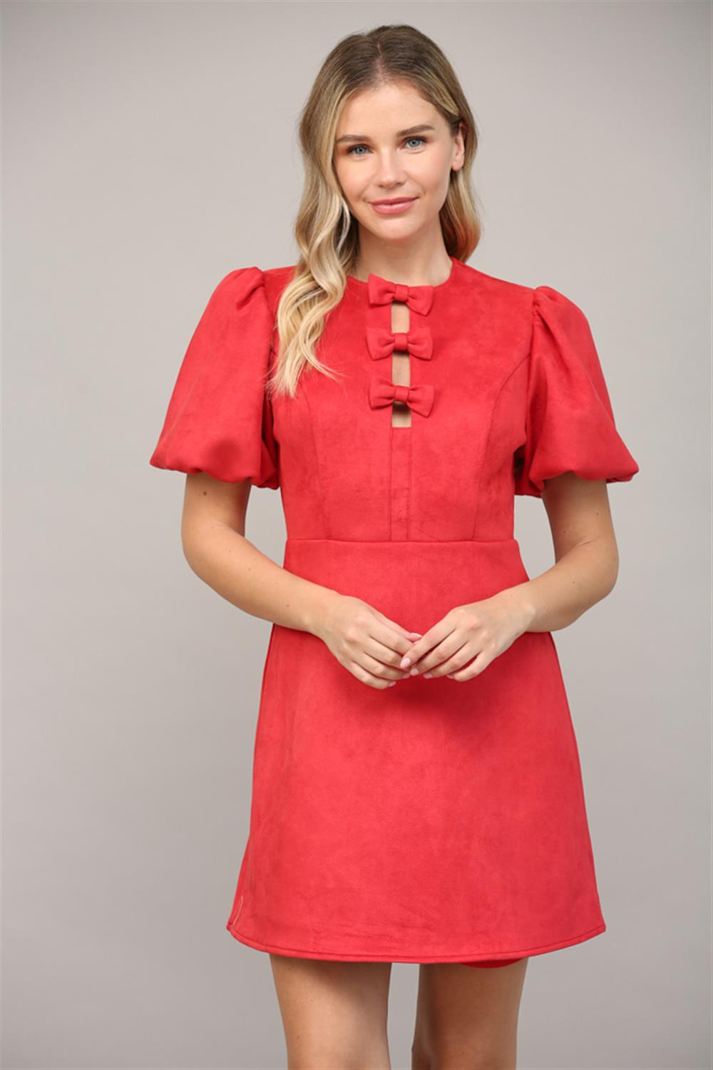 The Bow Puff Sleeve Mini Dress is perfect for the holiday season. This dress features three bows on the front along with puff short sleeves that elevate the look.