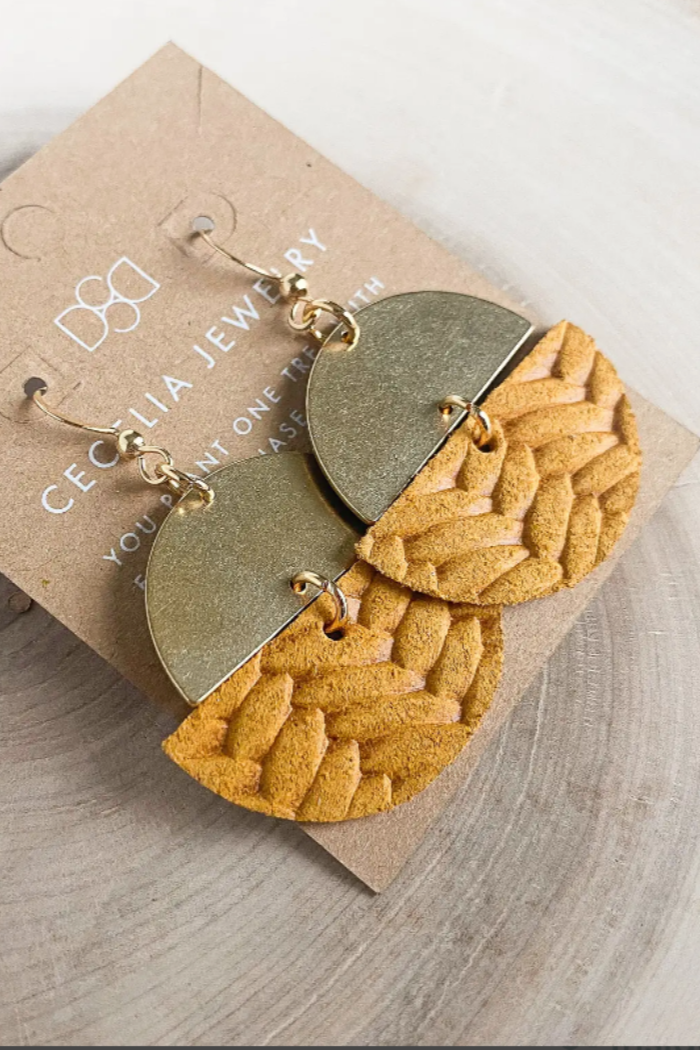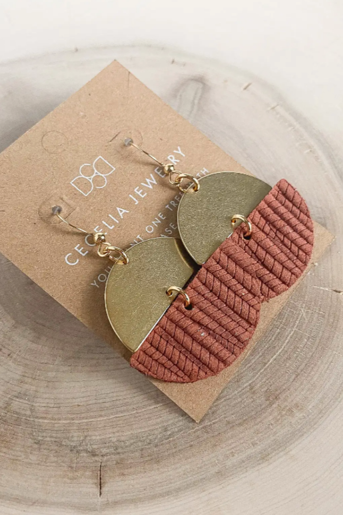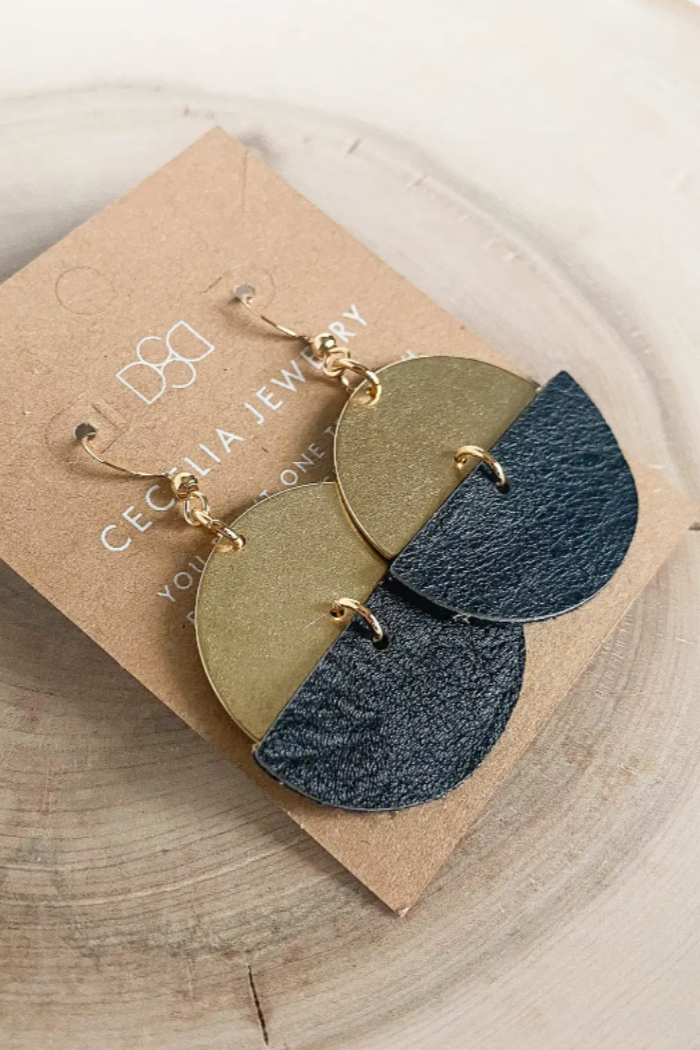 featuring our brass and leather half moon leather earring collection. You plant one tree with each purchase. These hoop earrings are handmade in the USA using gold plated brass, genuine leather and nickel free earrings hooks. 2" L x 1.5" W.