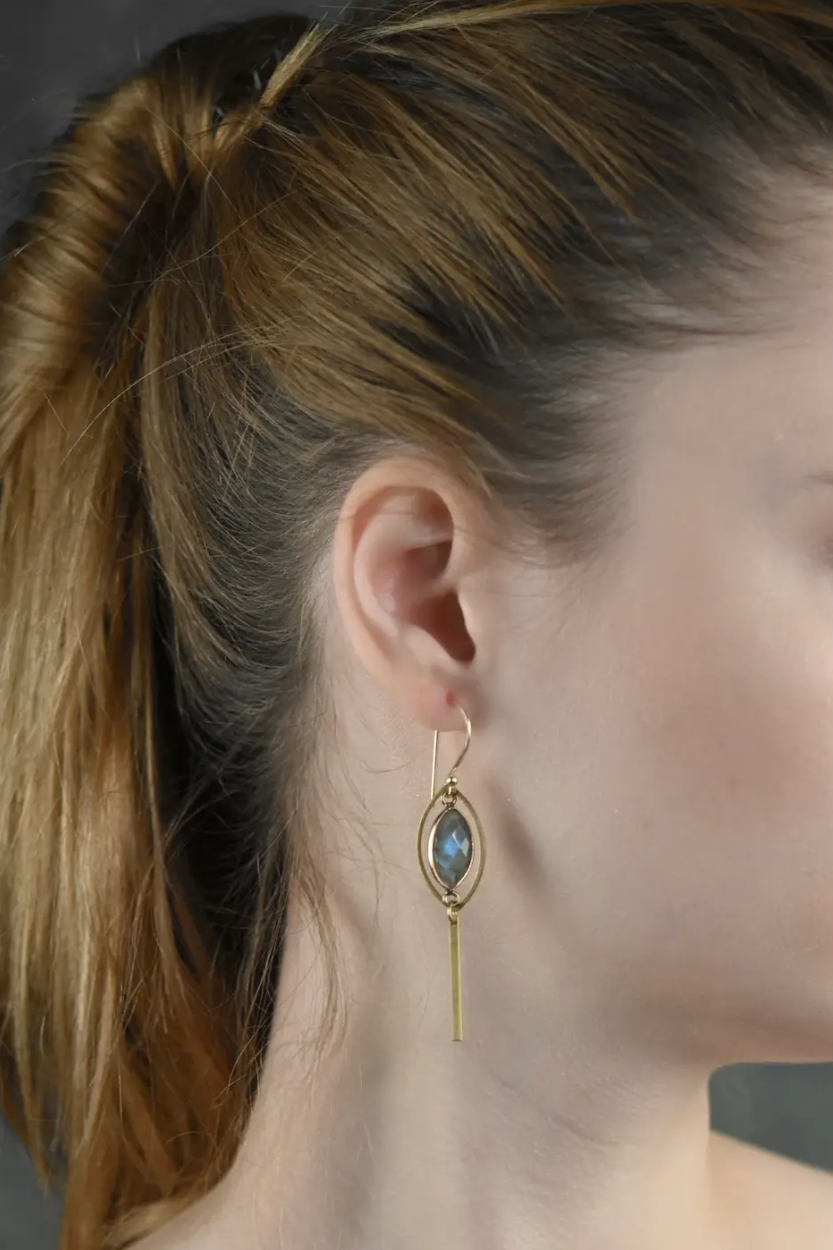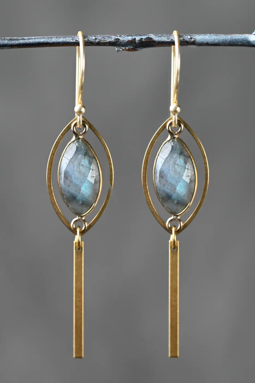 A beautiful marquise Semi Precious Gemstone floats inside of an open brass marquise with stick drop.