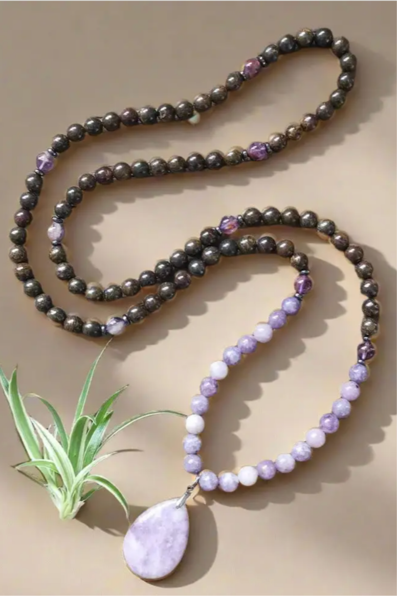 Handcrafted with 108 beads of natural Bronzite and Lepidolite, this mala necklace promotes grounding and emotional balance. Featuring a Lepidolite pendant, it enhances tranquility and emotional well-being. Bronzite aids in grounding and protection, while Lepidolite supports stress relief and emotional healing. Perfect for daily wear or meditation, this necklace measures around 91cm.