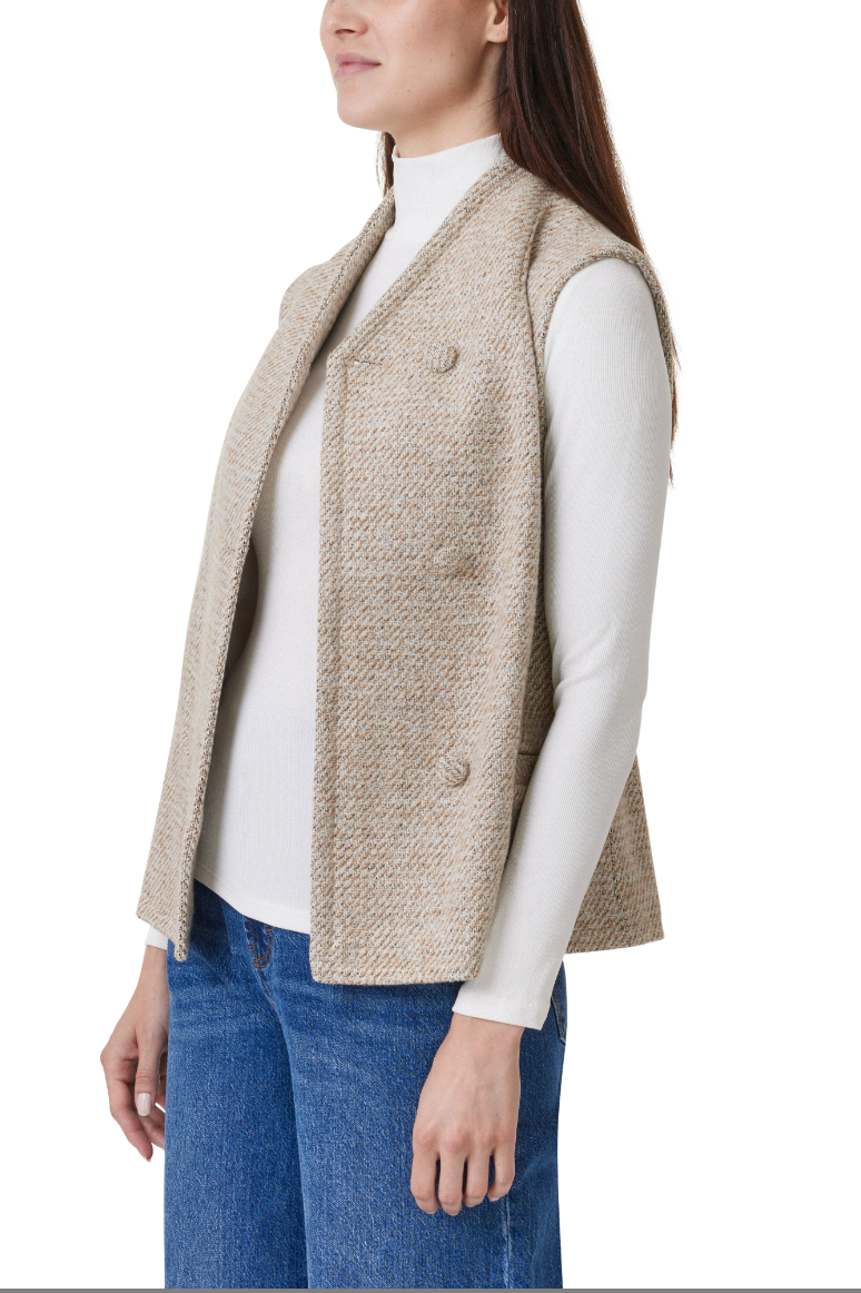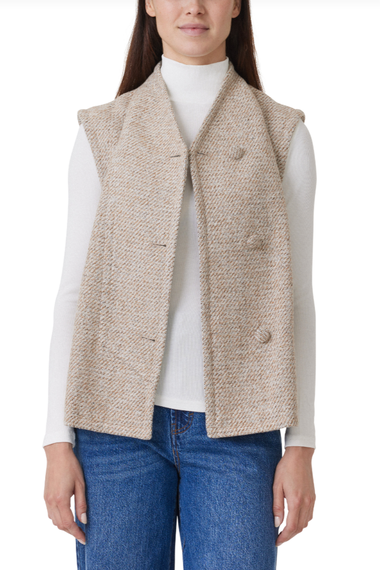 Brushed twill vest in oatmeal with seam detail and 3 covered buttons for closure. This is an updated menswear style vest that looks great with jeans and boots.