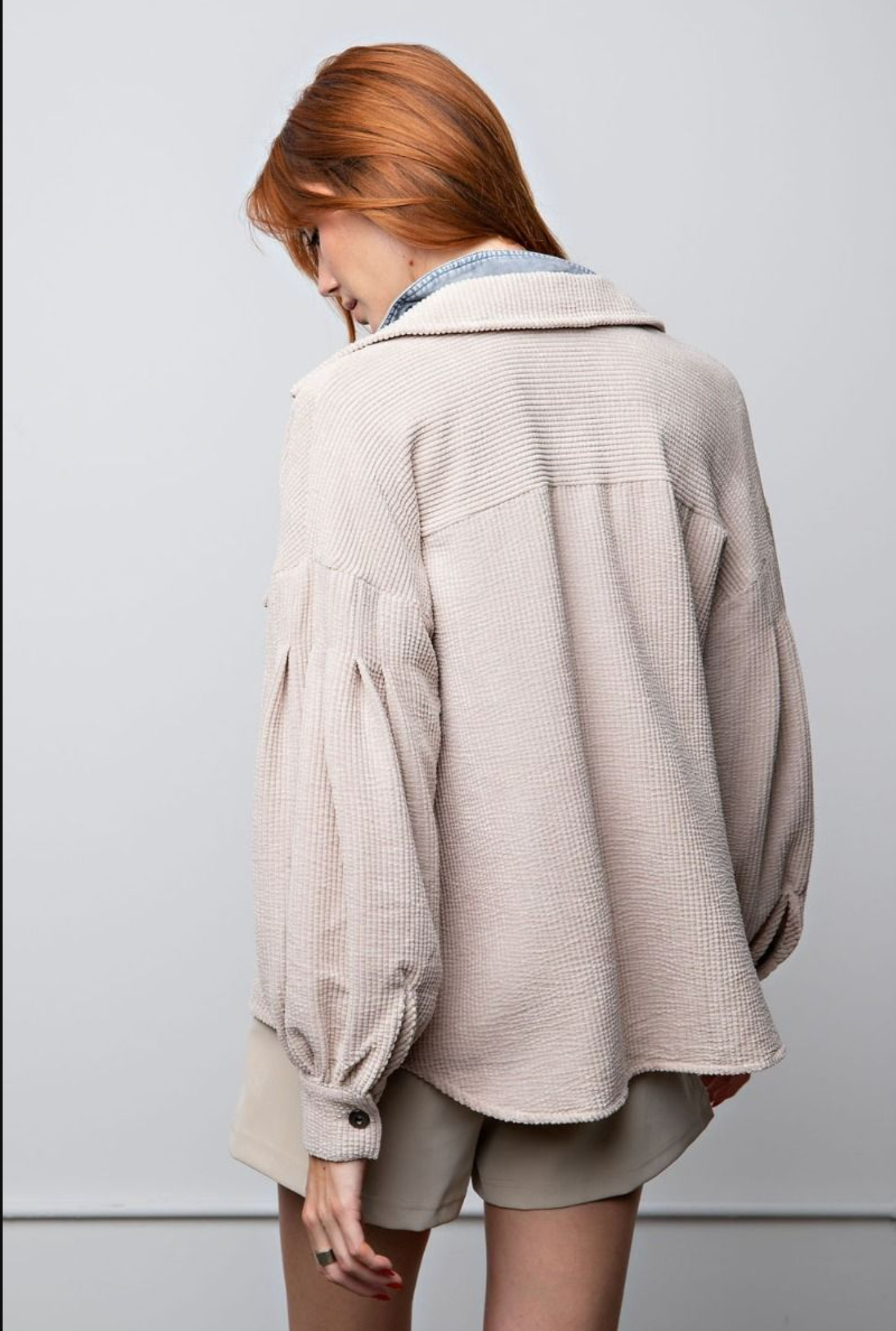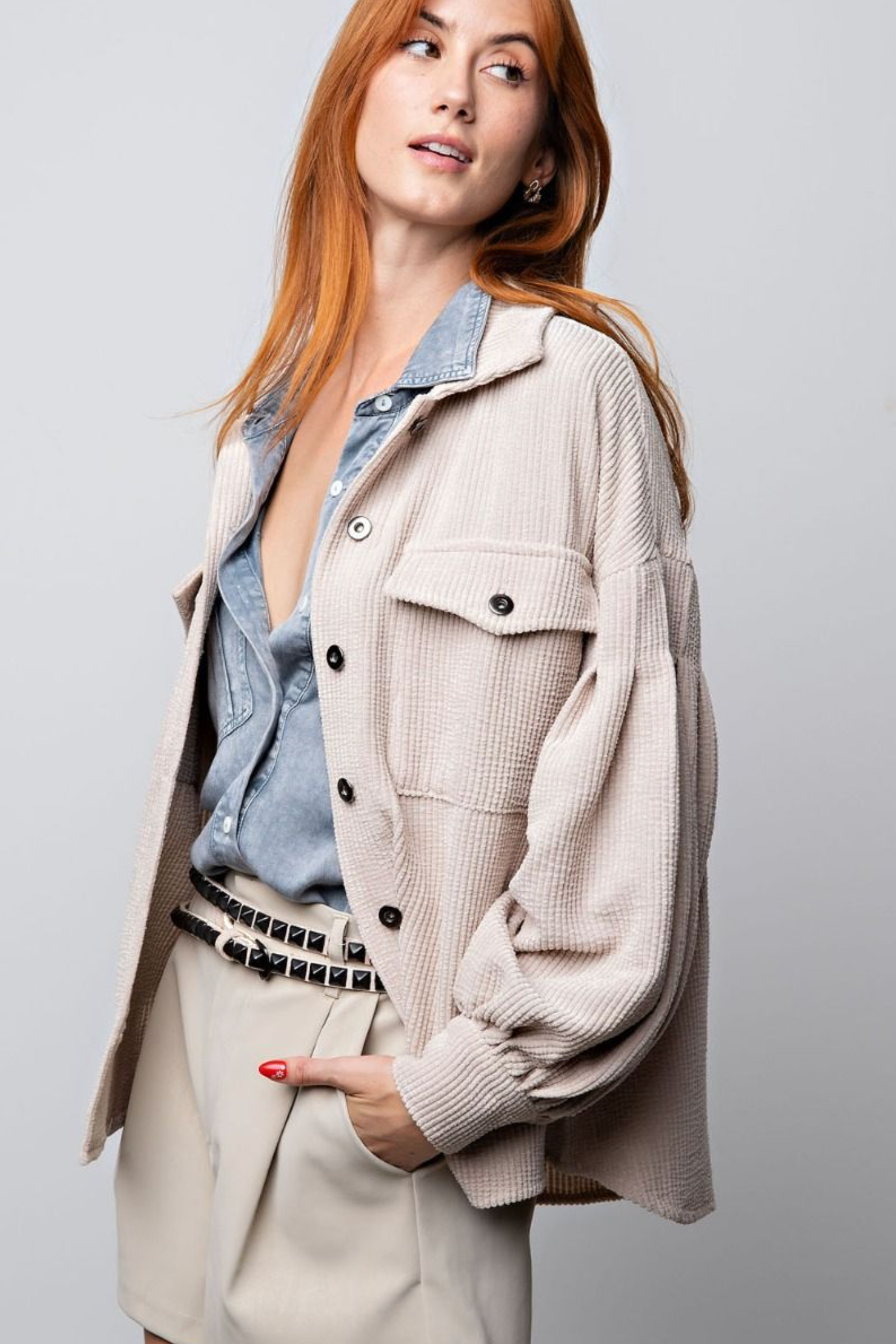 This corduroy shacket is a great fall basic. It has the classic collared neckline, button down front chest flap pockets and has a loose fit.