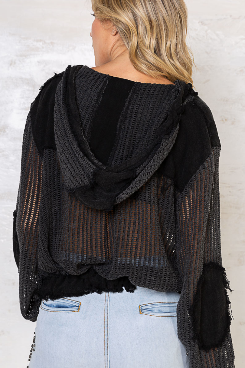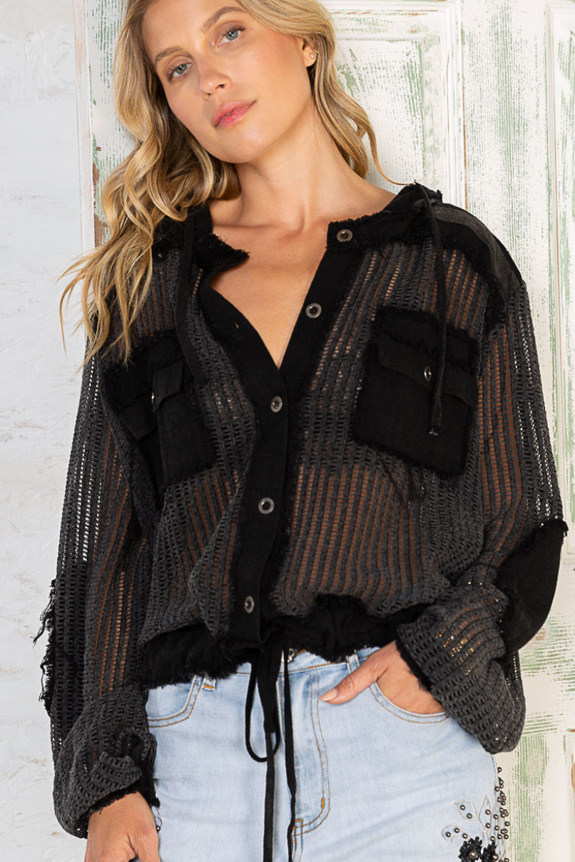 Designed in see through button down hoodie top, frayed edge throughout the garment, chest pocket, elbow patch. featured in textured woven