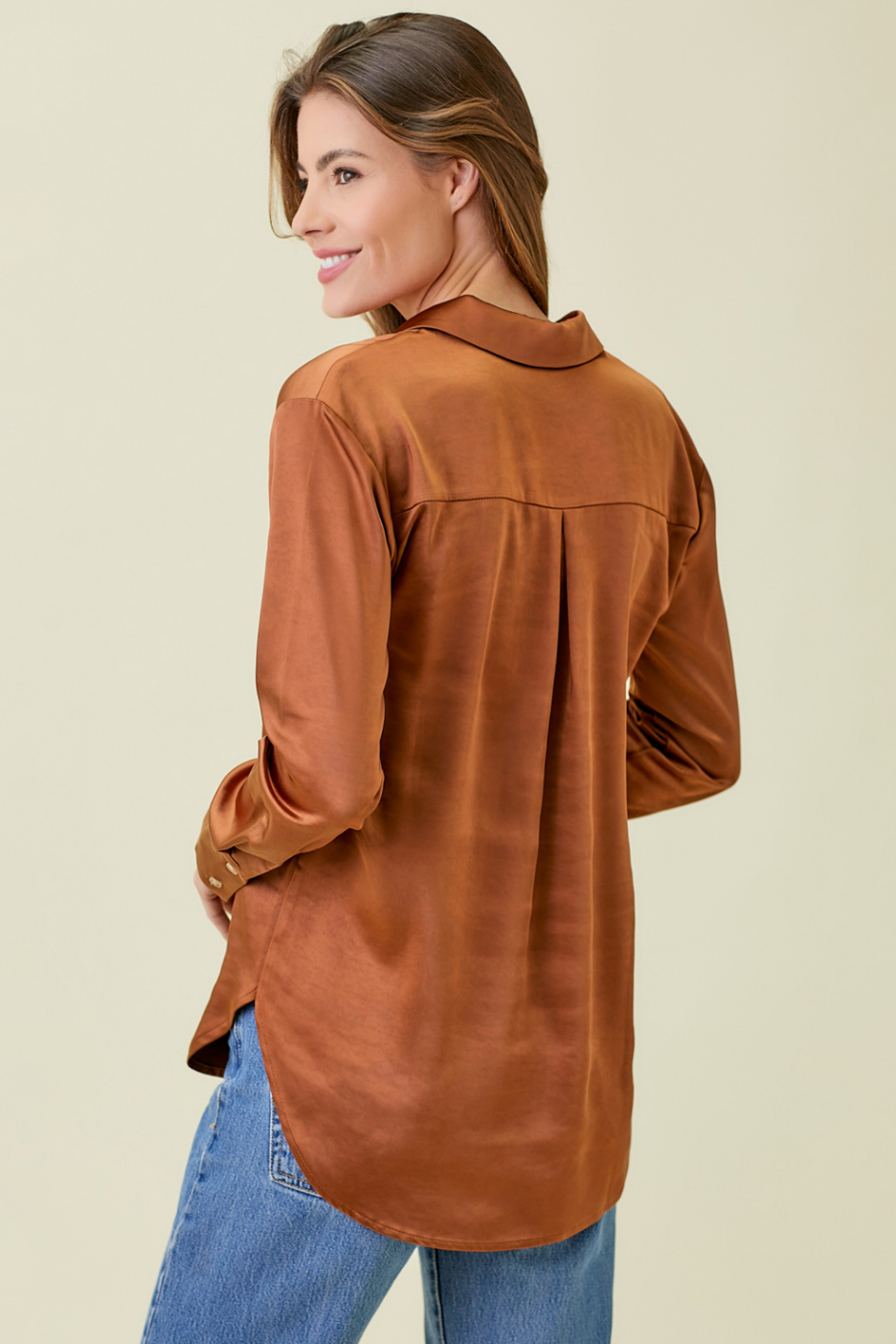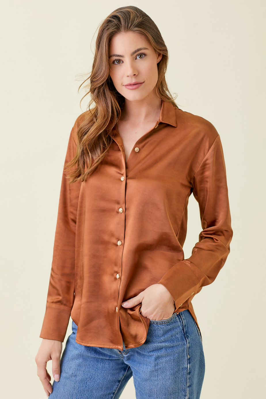 This Button Down Silky Shirt will give you a sleek and classy look! This shirt has a hi-lo hem, and a relaxed wear making it comfortable yet chic to wear.