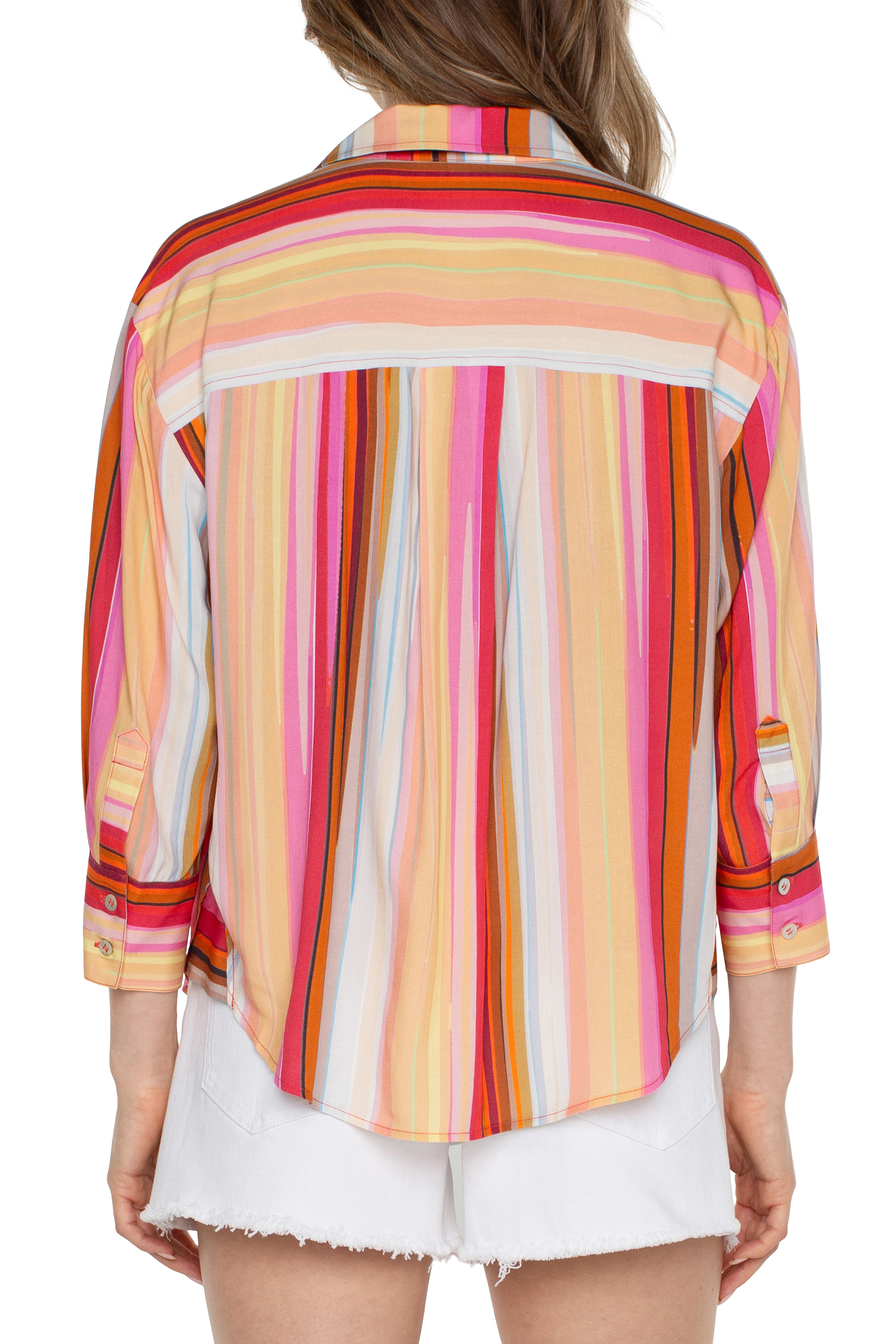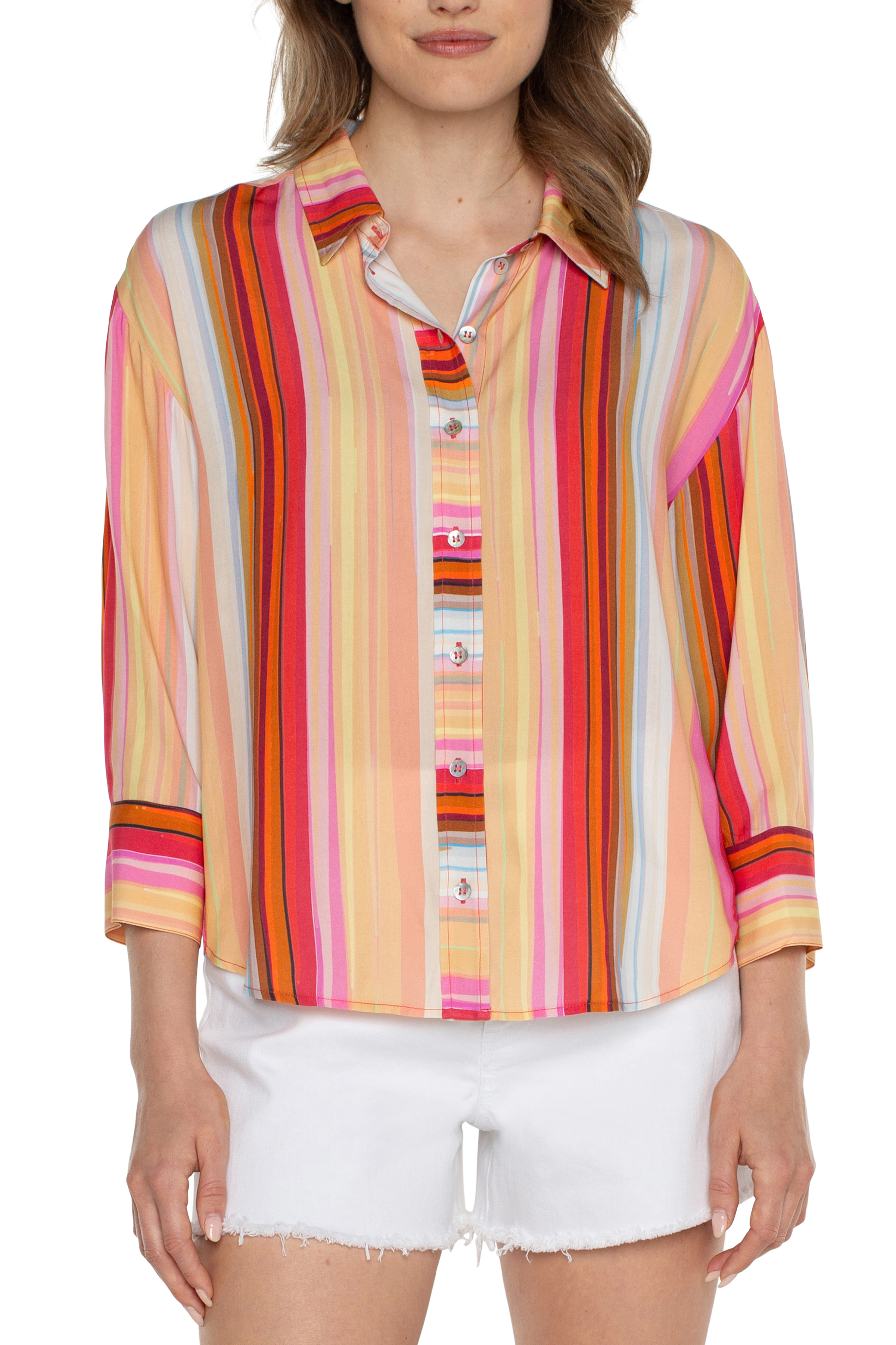 Add some color to your closet with this button front stripe shirt! This shirt has a button front that can be worn open with a tank underneath or can be buttoned to be worn on its own.